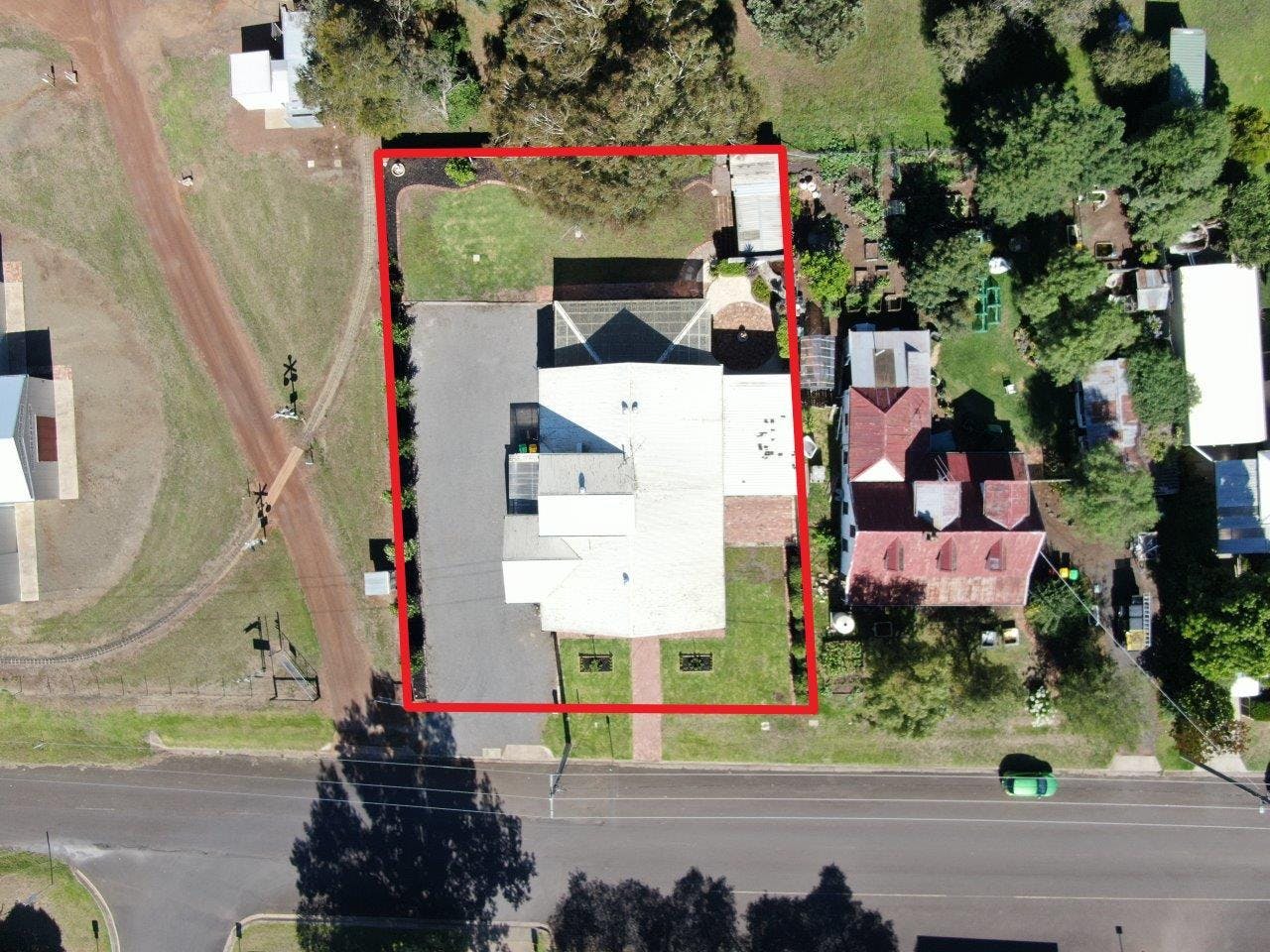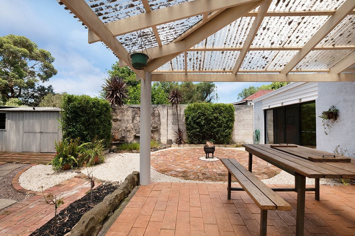 The rear yard is beautifully maintained, featuring stone-edged lawns, established gardens, a paved firepit area, tranquil water feature, garden shed, and mature trees providing shade and serenity. The front façade offers timeless street appeal, with standard roses lining the path to the covered veranda and a wide driveway allowing ample parking and easy turnaround access.