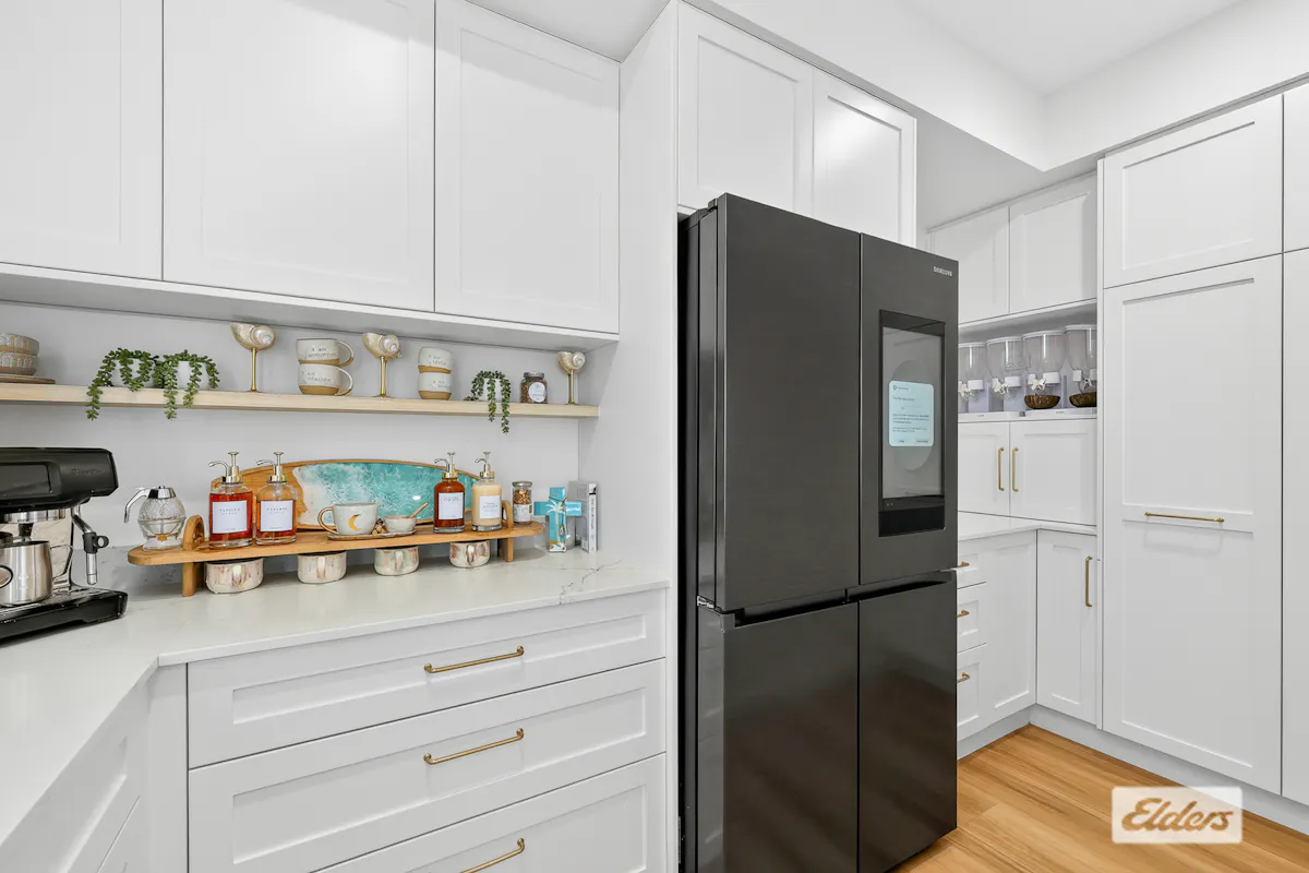 * Designer kitchen with butler's pantry, stone benchtops and splashback, soft-close cabinetry, gold hardware, integrated dishwasher and quality finishes