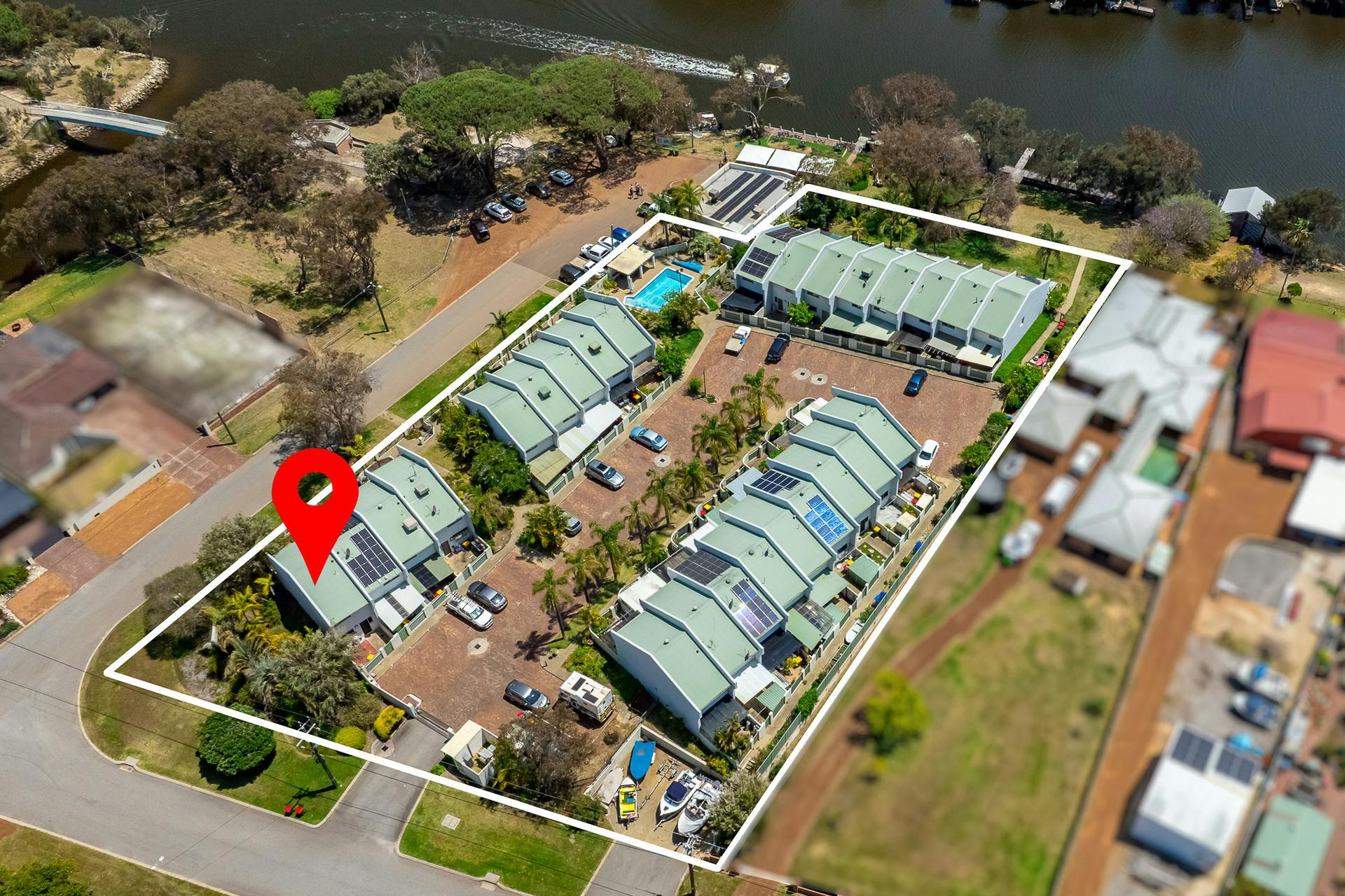 Residents enjoy an exclusive-use carbay, electric gated entry for peace of mind, a sparkling swimming pool, and dedicated shared boat and trailer storage-perfect for those who love the waterways and want convenience close to home.