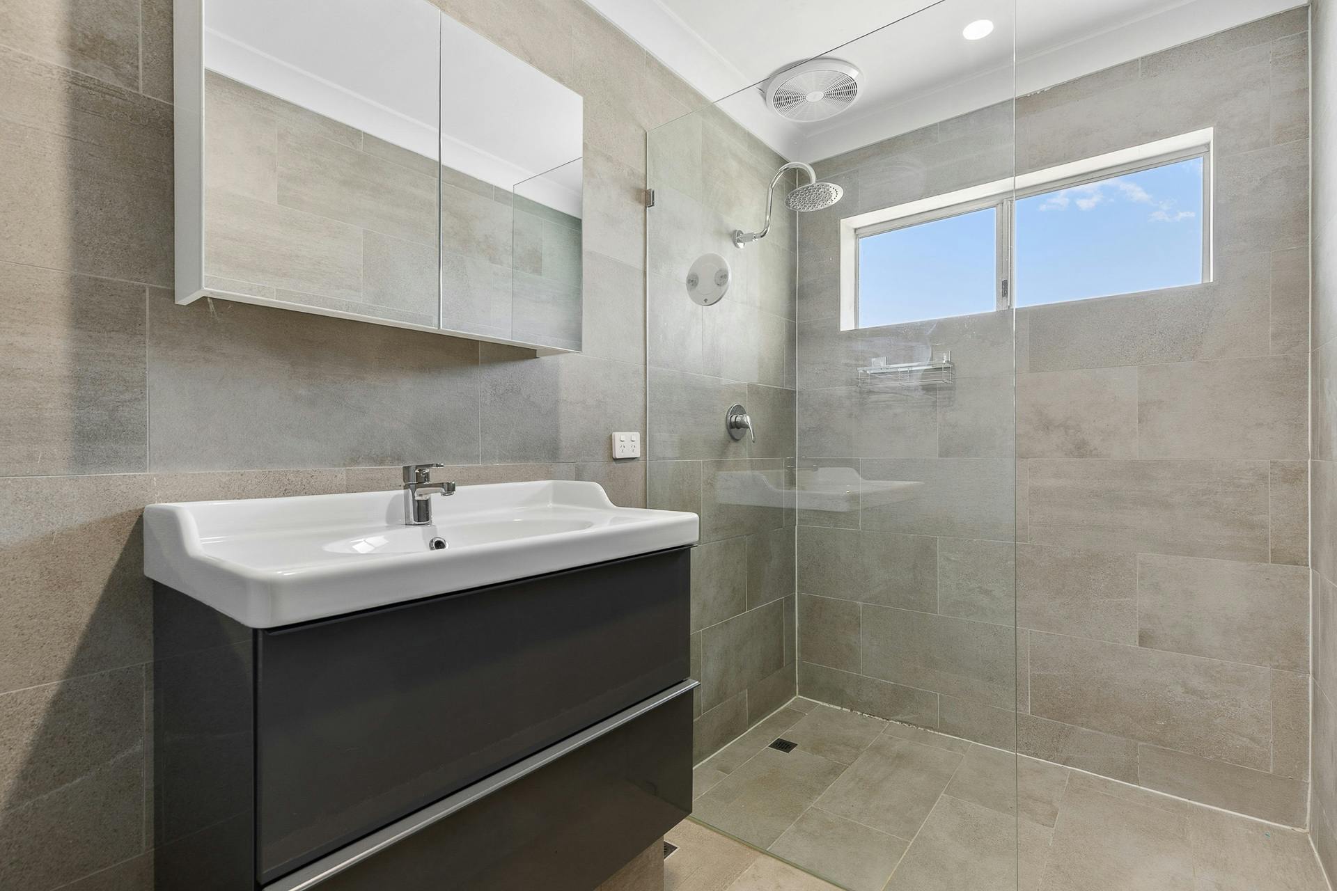 • Modern bathroom with large shower, floor-to-ceiling tiling
