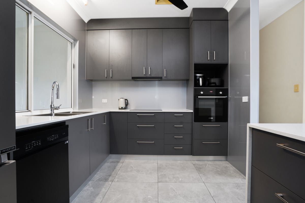At the heart of things, the kitchen is a dream. Accentuated by sleek grey cabinetry, stone benches and modern appliances, it impresses further with a fabulous waterfall island breakfast bar, abundant storage and a handy servery to the adjoining family room.
