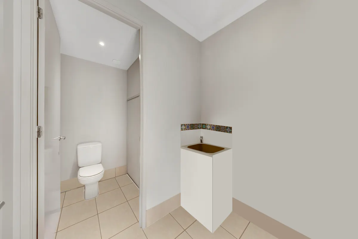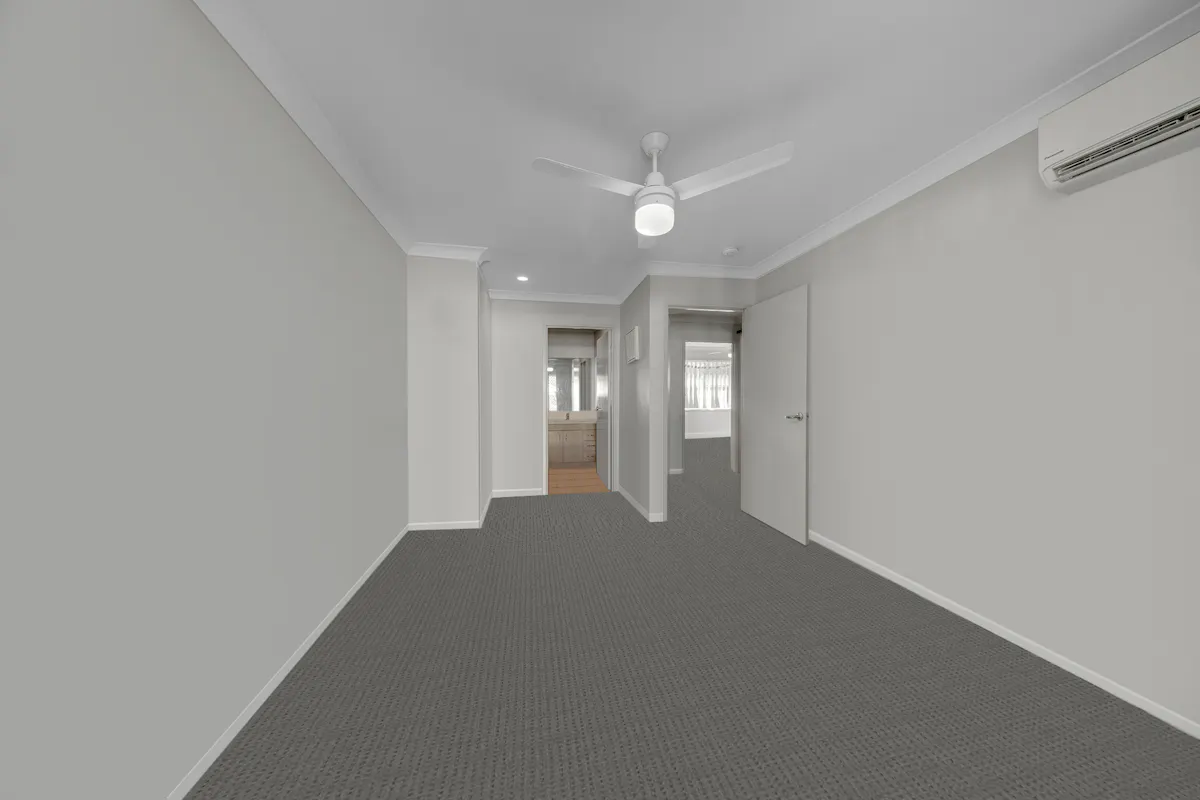 Upstairs, the accommodation is well separated and generously proportioned. Bedrooms are carpeted and include built-in wardrobes, ceiling fans and air-conditioning for year-round comfort. The master suite enjoys the added luxury of its own private balcony and ensuite, while the remaining bedroom is serviced by a modern main bathroom.