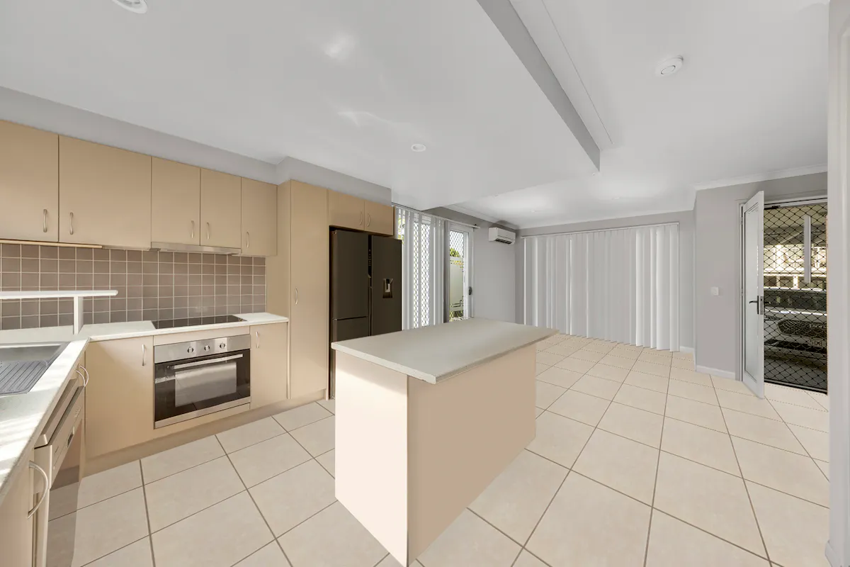 The lower level features an open‑plan kitchen, dining and living zone finished with neutral tones and tiled flooring for easy care. The contemporary kitchen is well appointed with ample cabinetry, quality appliances, a large island bench and excellent bench space-perfect for everyday living and entertaining. Sliding doors connect the living area to the private, fenced courtyard, creating a seamless indoor–outdoor flow.