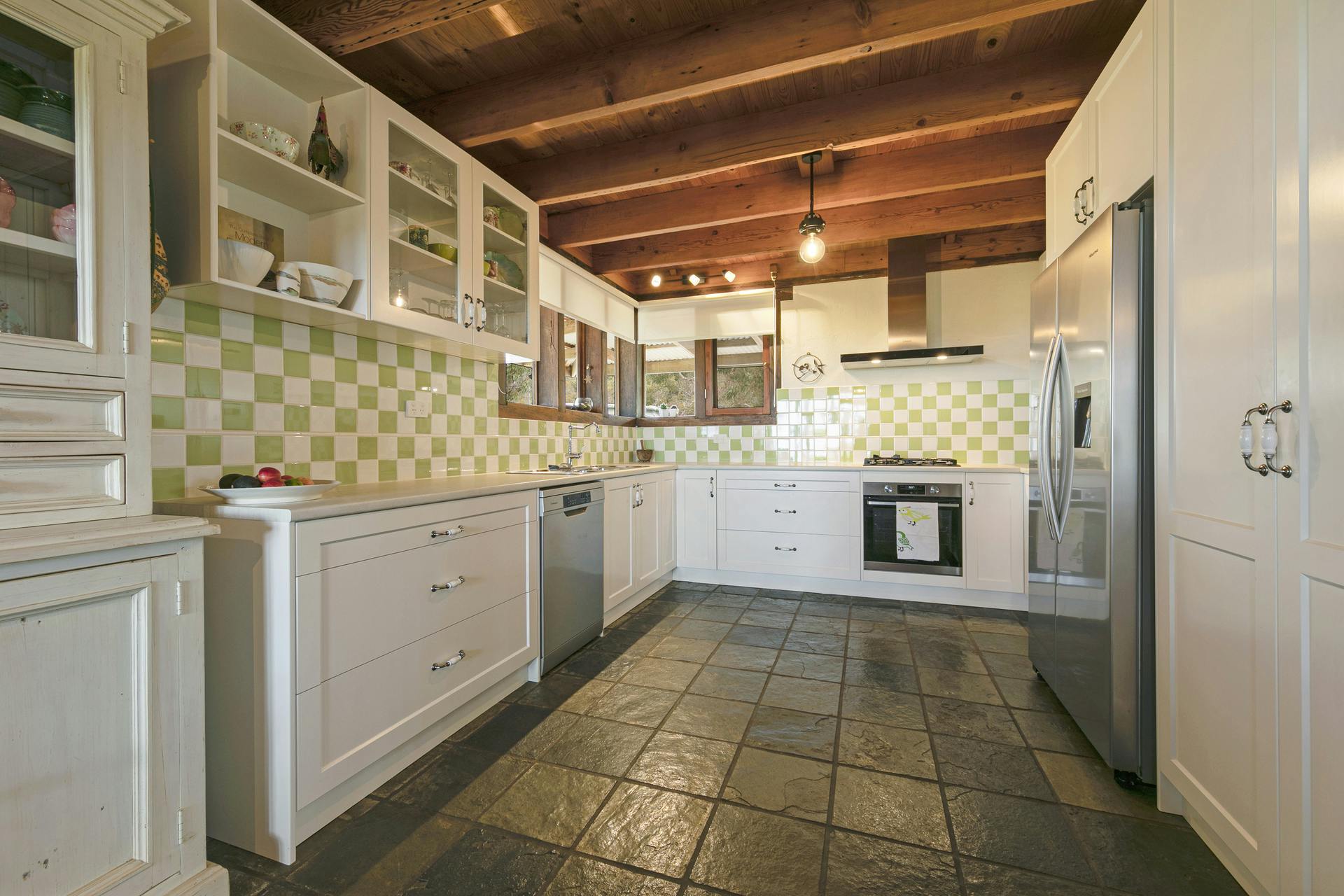 Boasting quality fixtures and fittings throughout, recently renovated kitchen, spacious modern open plan ground floor living, which has been tastefully decorated. Stain glass windows, new window furnishings, slate floors, cosy combustion wood heating, blissful elevated rural views from every window and the wide paved return verandah.