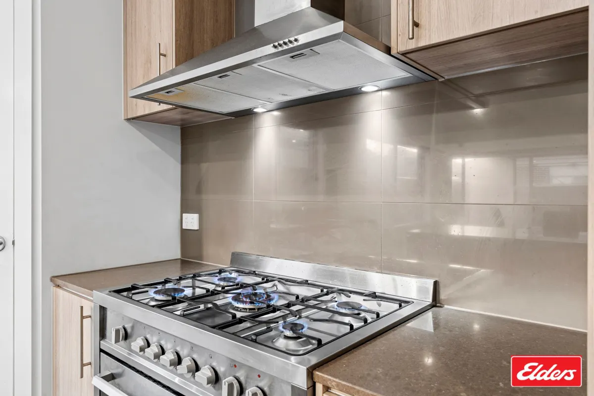 The kitchen is centrally located and fitted with stone benchtops, a 900mm stainless steel cooktop and oven, a walk-in pantry and ample storage. Sliding doors connect the main living area to a covered alfresco with exposed aggregate concrete, creating a functional outdoor space.