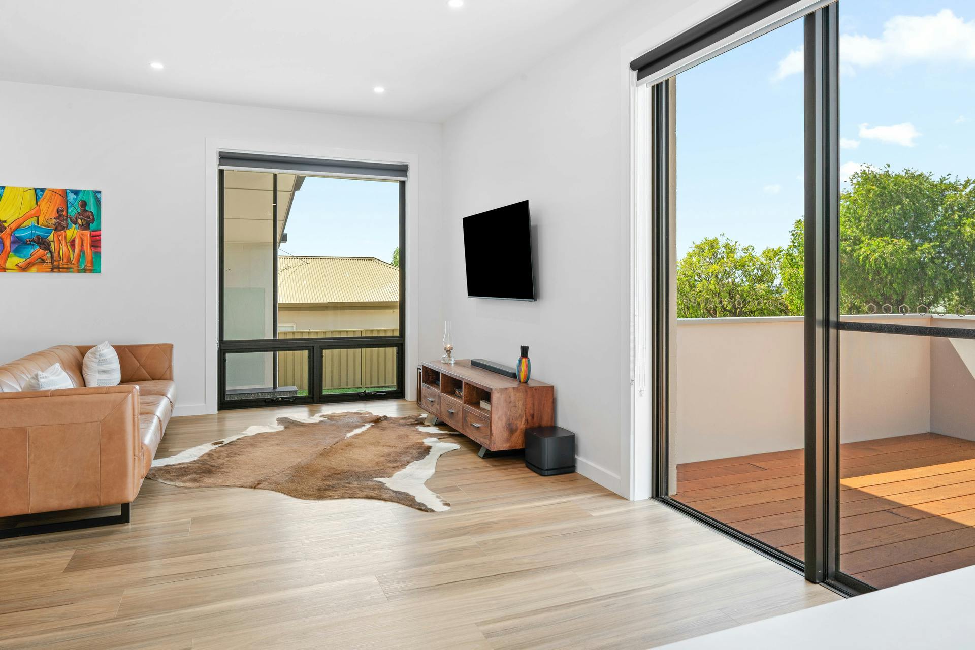Large windows and sliding doors invite natural light throughout while opening onto the front balcony deck, the perfect spot for morning coffee while overlooking the street.