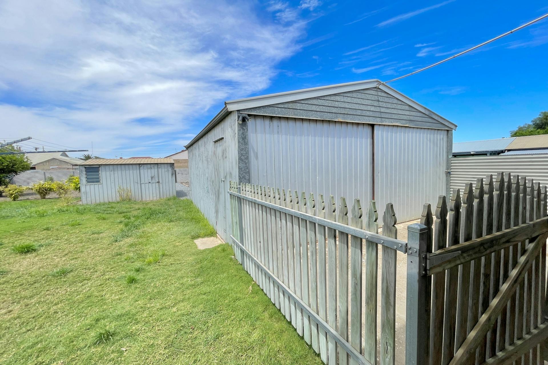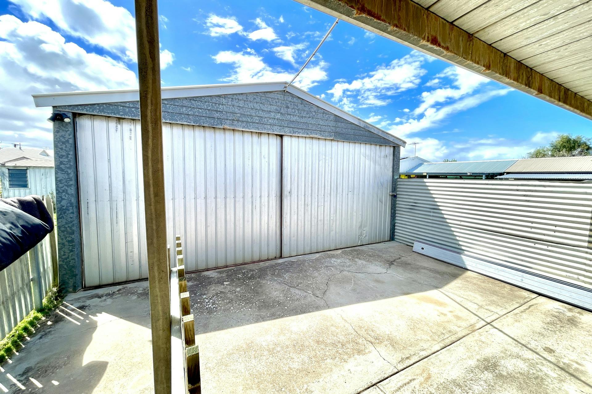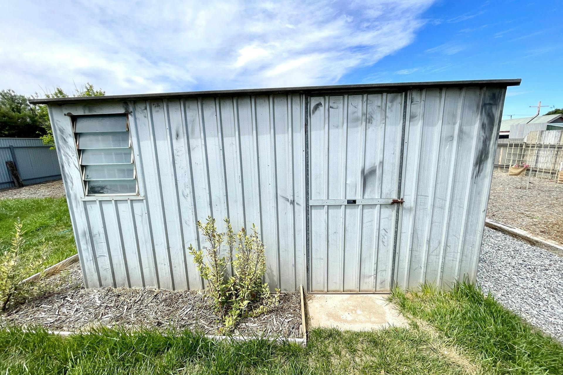 The spacious backyard offers a generous lawn area, 8m x 7m double garage with cement floor, power, and lighting, plus a 4m x 4m garden shed, established fruit trees, and ample space for a vegetable garden. A long carport runs alongside the home, providing sheltered parking for up to three vehicles.