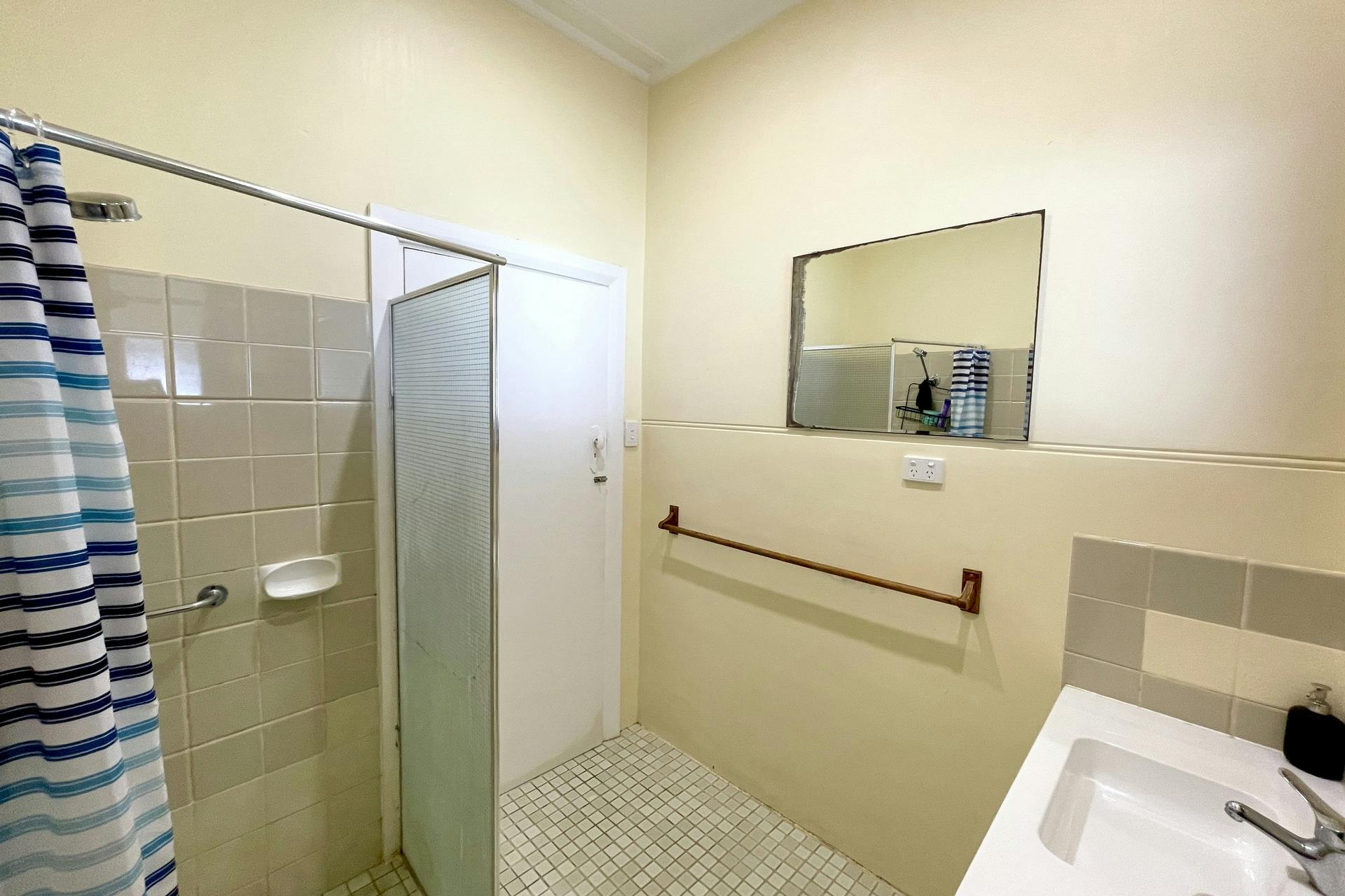 Both bedrooms are carpeted and feature ceiling fans, with the main bedroom also offering a cool-only wall air conditioner. The bathroom is well-equipped with a corner vanity, wall mirror, toilet, and a shower alcove with glass screen, curtain, and safety hand railings.