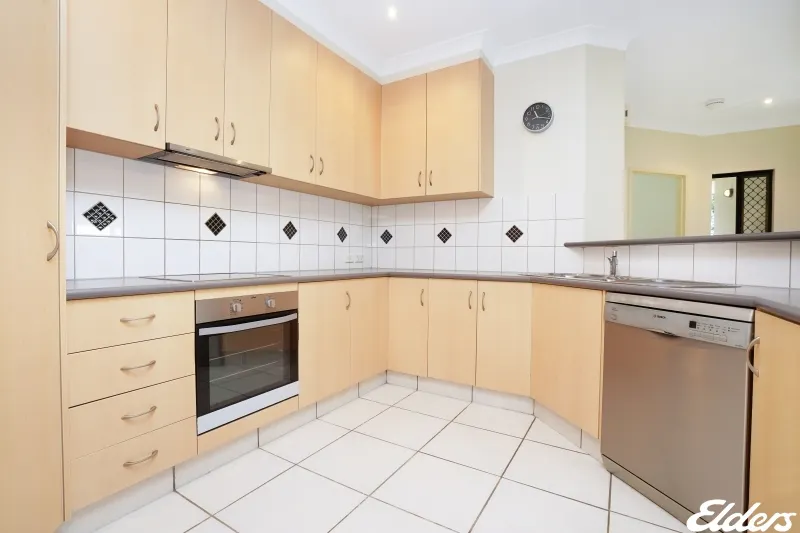 Continue past the second bedroom on your right, and into the spacious open-plan living/dining area that features a large modern kitchen. With a high breakfast bar, plentiful cupboard space including a large corner pantry, and quality stainless steel appliances including an under-bench oven and dishwasher.