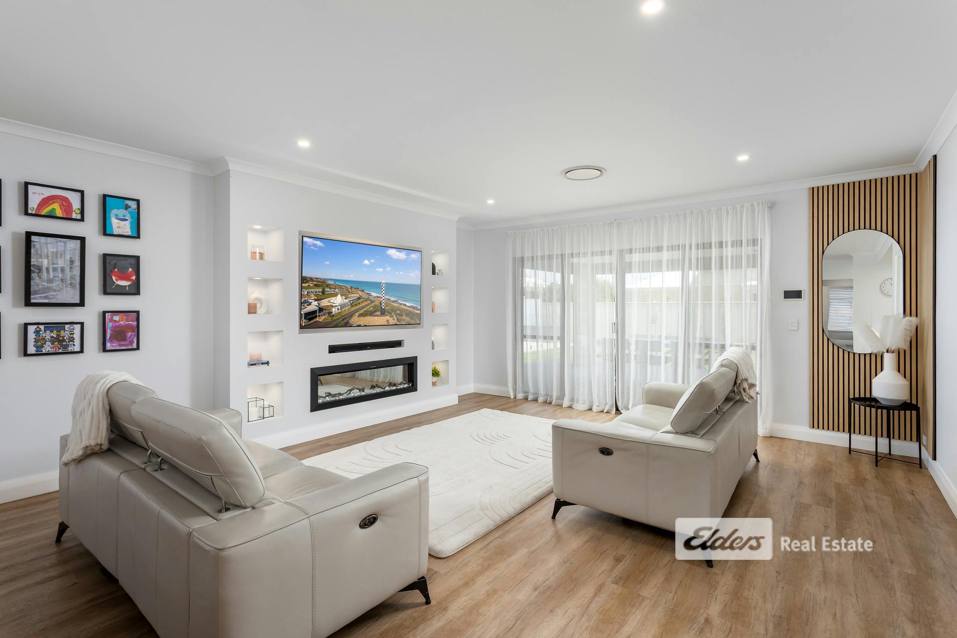 Main living room includes a media wall with built-in electric fireplace - a cosy focal point for family living.