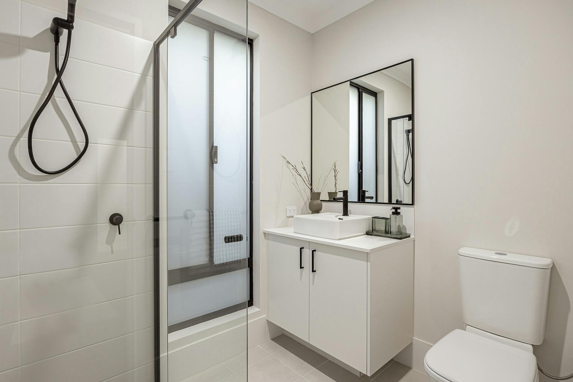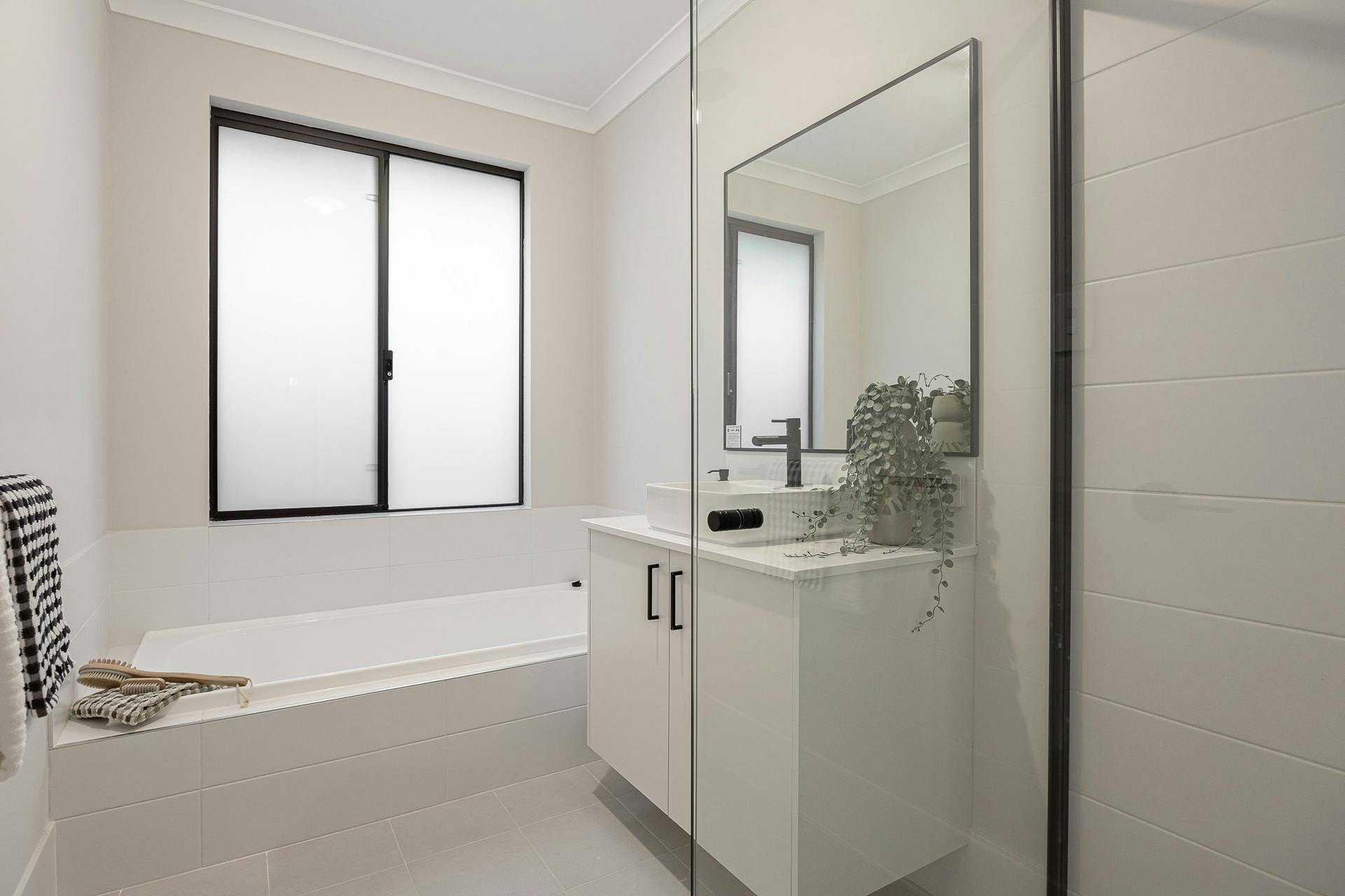 - Inviting master suite to the front of the home, with a feature corner window, a walk-in robe and a modern ensuite with a glass shower enclosure, stone topped vanity and WC, with timeless black accessories throughout