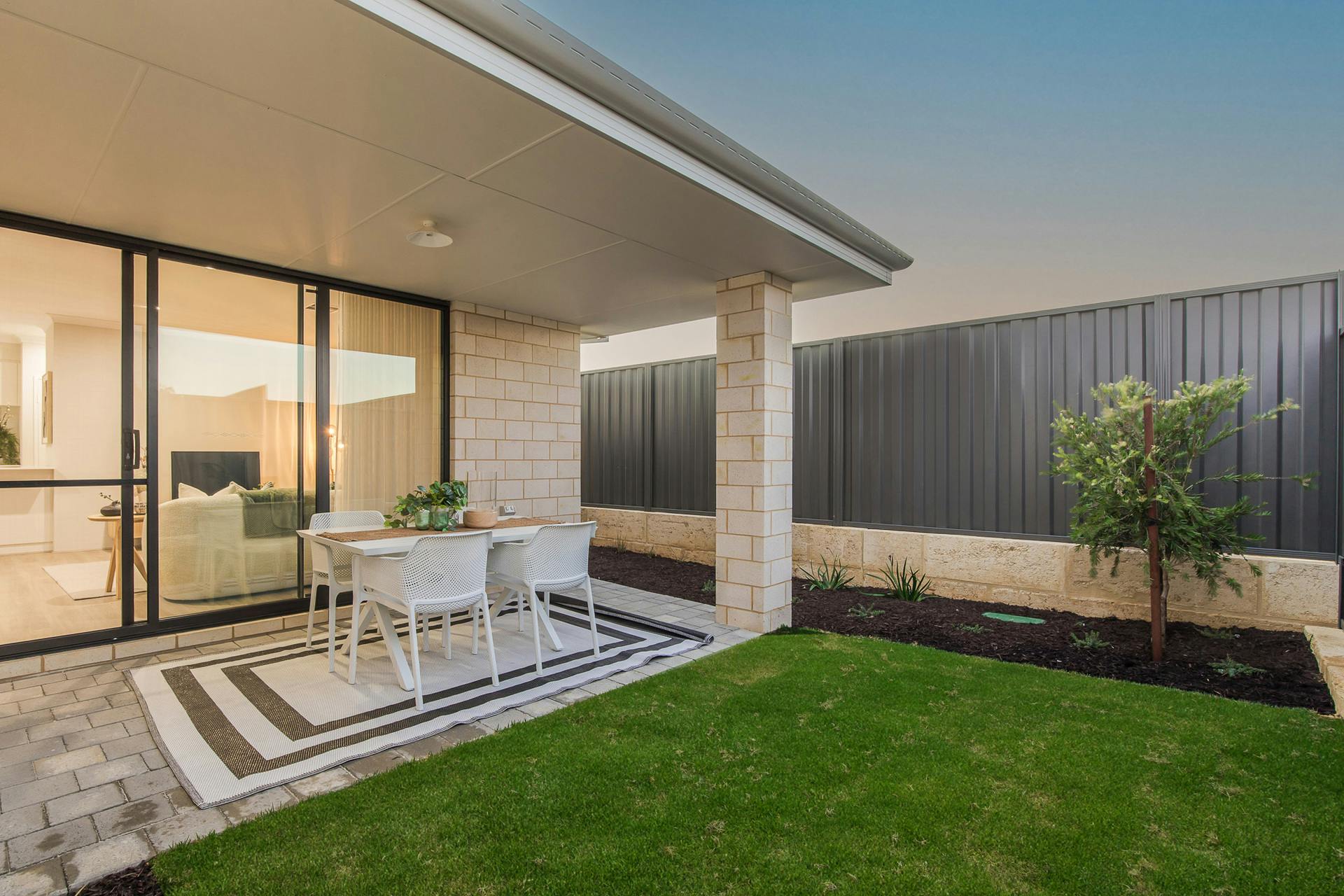 - Sheltered alfresco for outdoor entertaining, placed under the main roof for a continuous flow between, with paved flooring underfoot