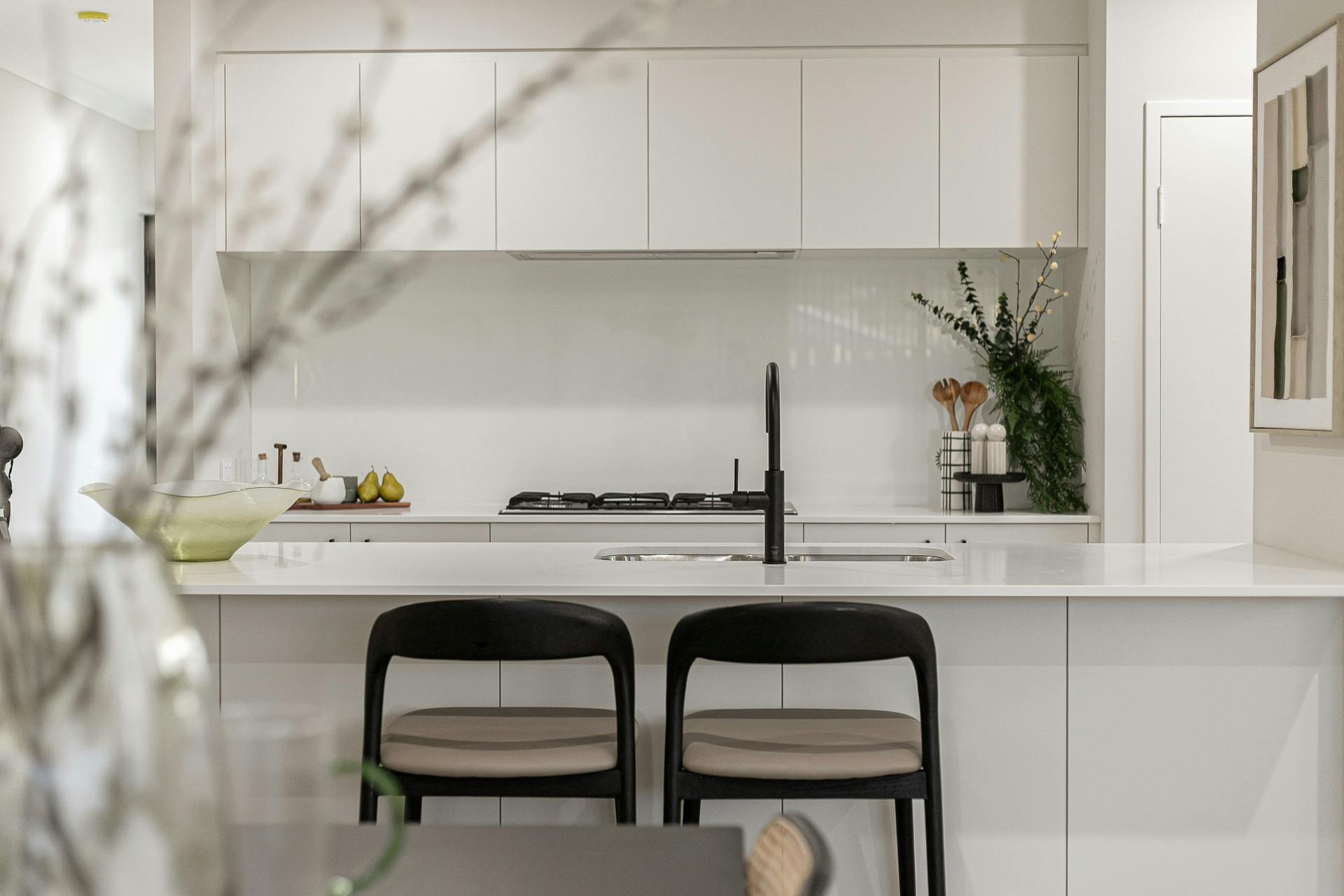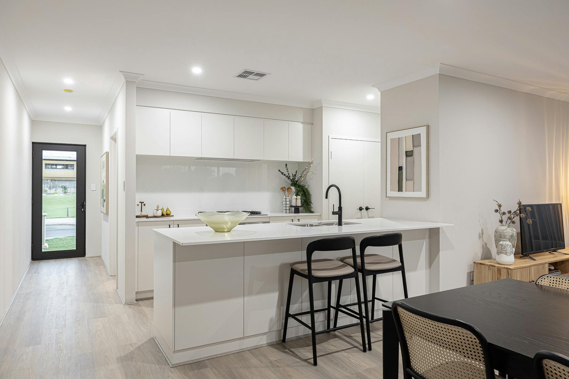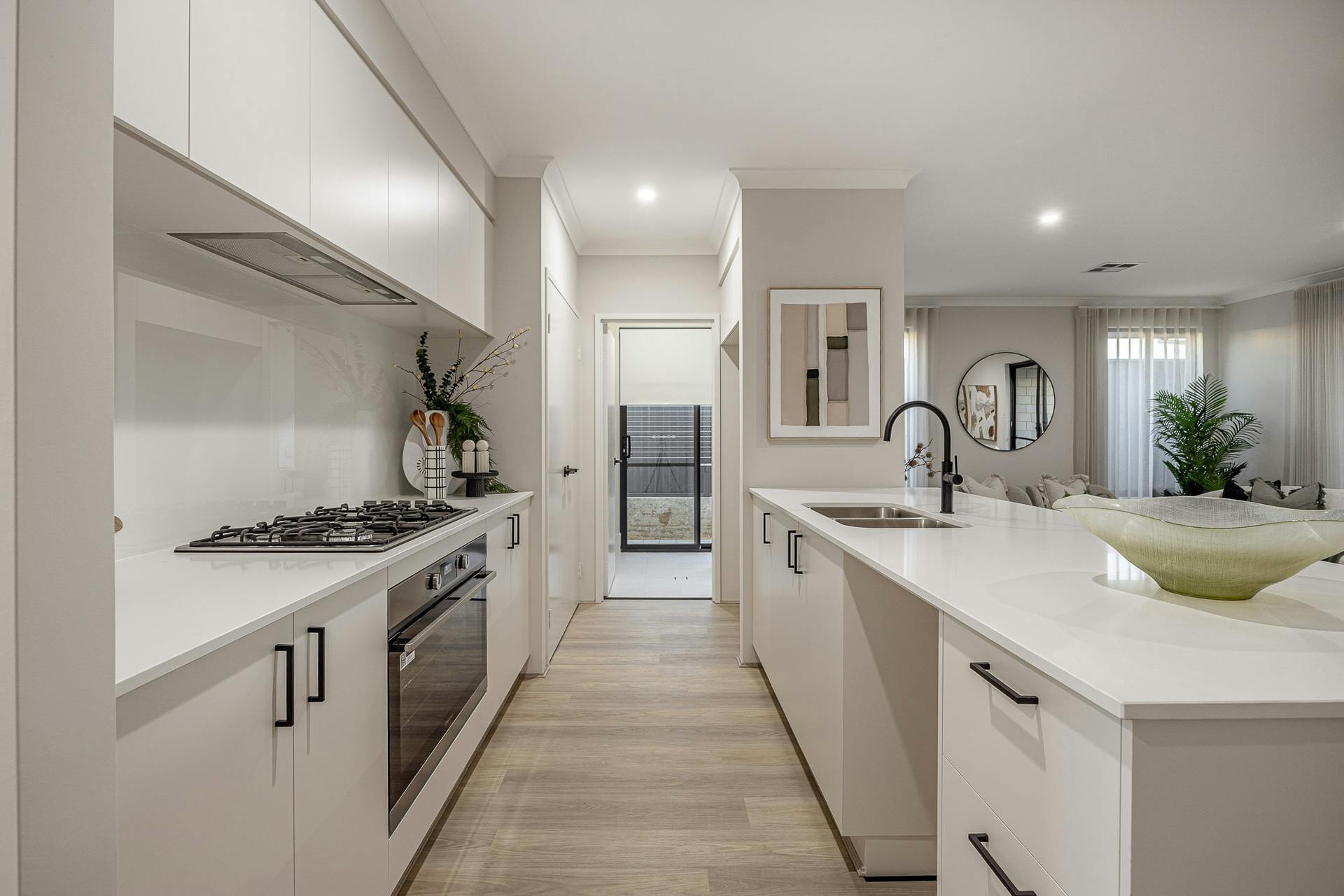 - Modern and fully fitted kitchen, with crisp white cabinetry to both the upper and lower, benchtops including a breakfast bar for casual gatherings and a dual door pantry, with in-built appliances for a seamless effect including a 900mm* oven, gas cooktop and integrated rangehood