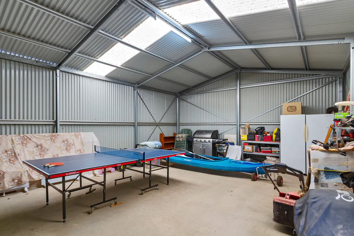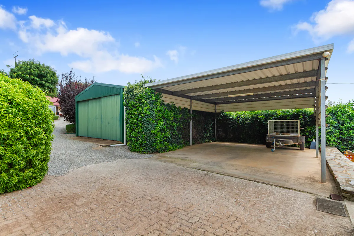 Convenient rear access, framed by blooming roses and established hedging, reveals generous parking options with ample space for a caravan and boat. A quality, powered garage with a concrete floor doubles as an excellent entertaining area, complemented by an adjoining carport for additional undercover parking.