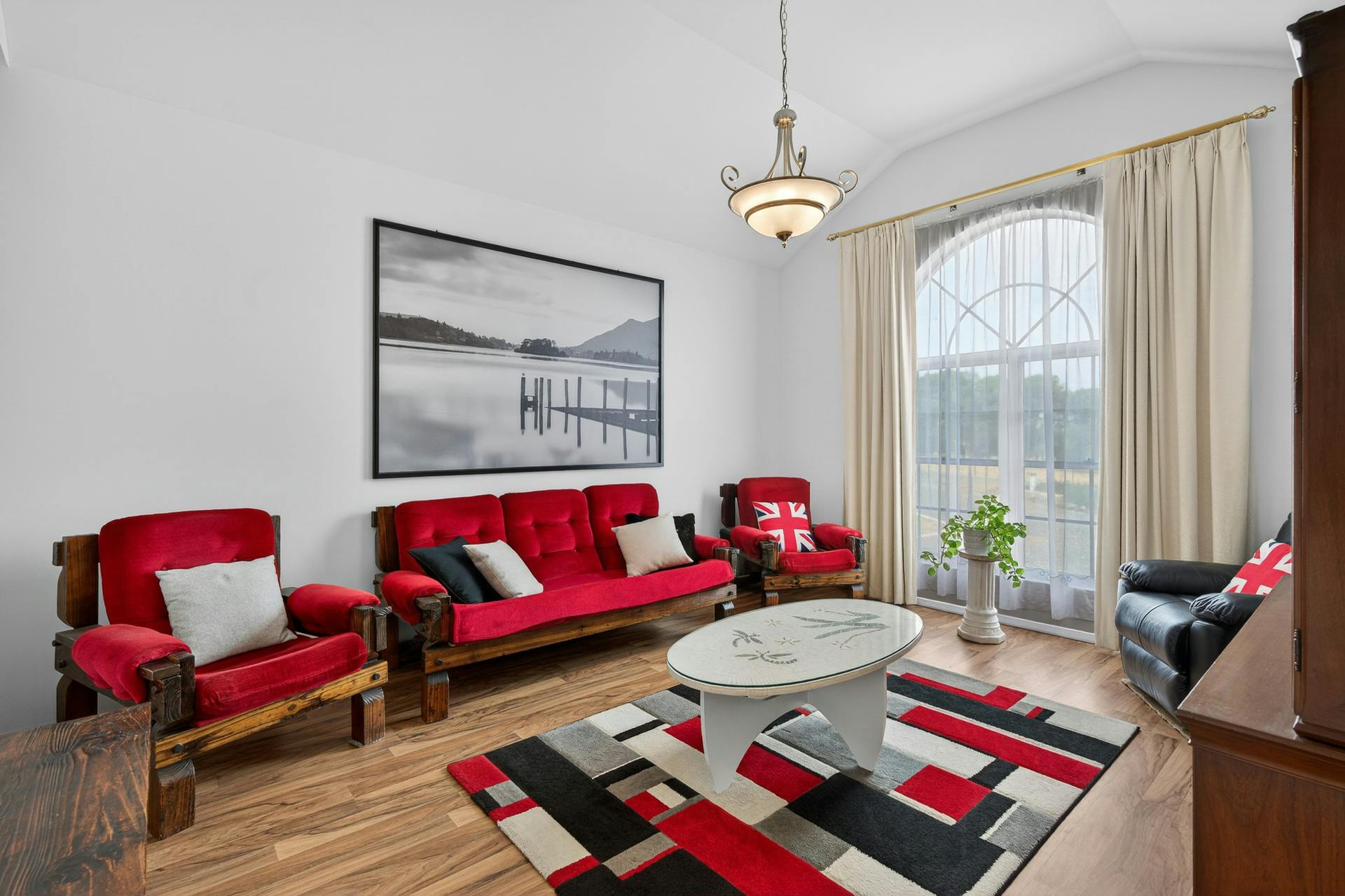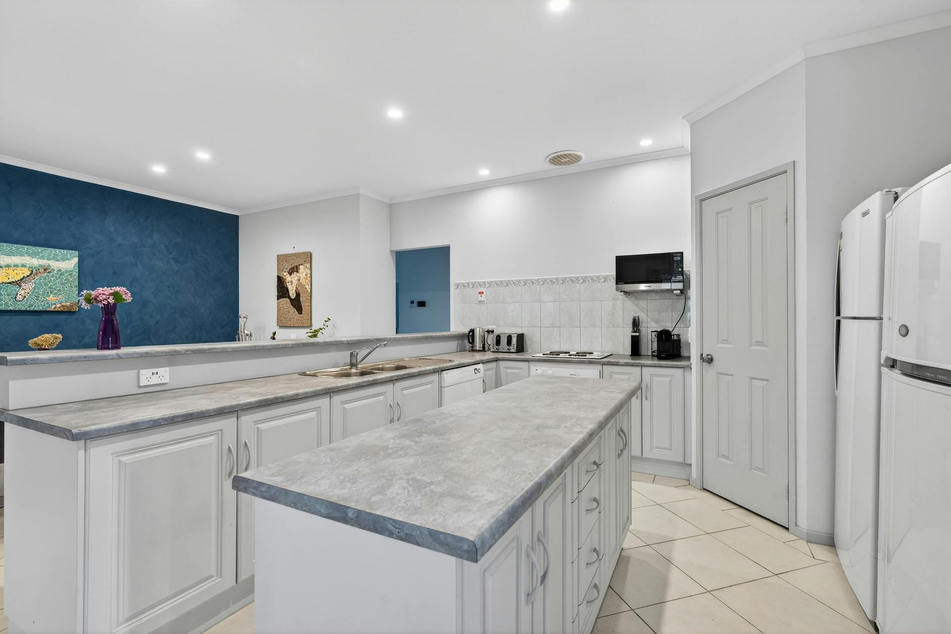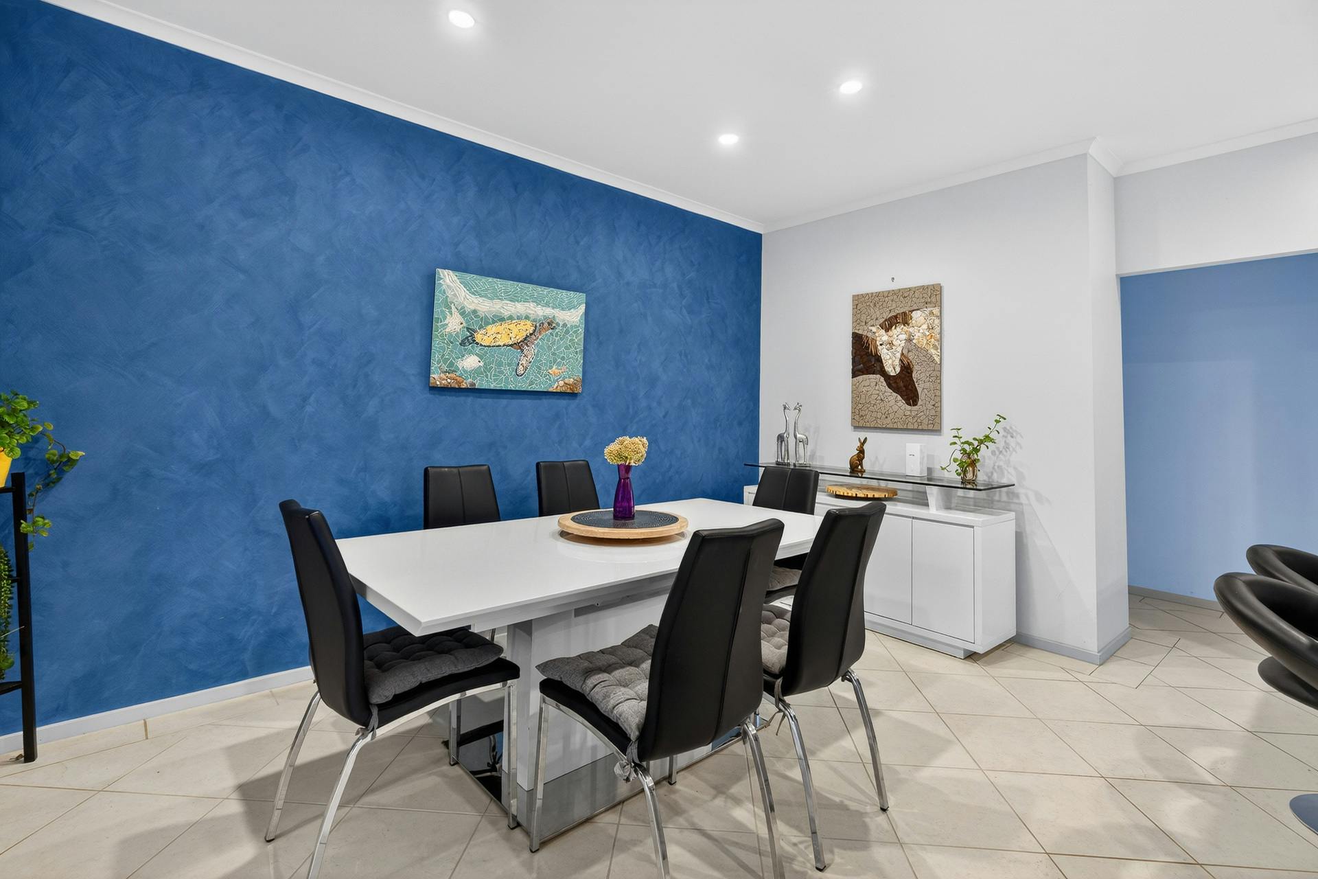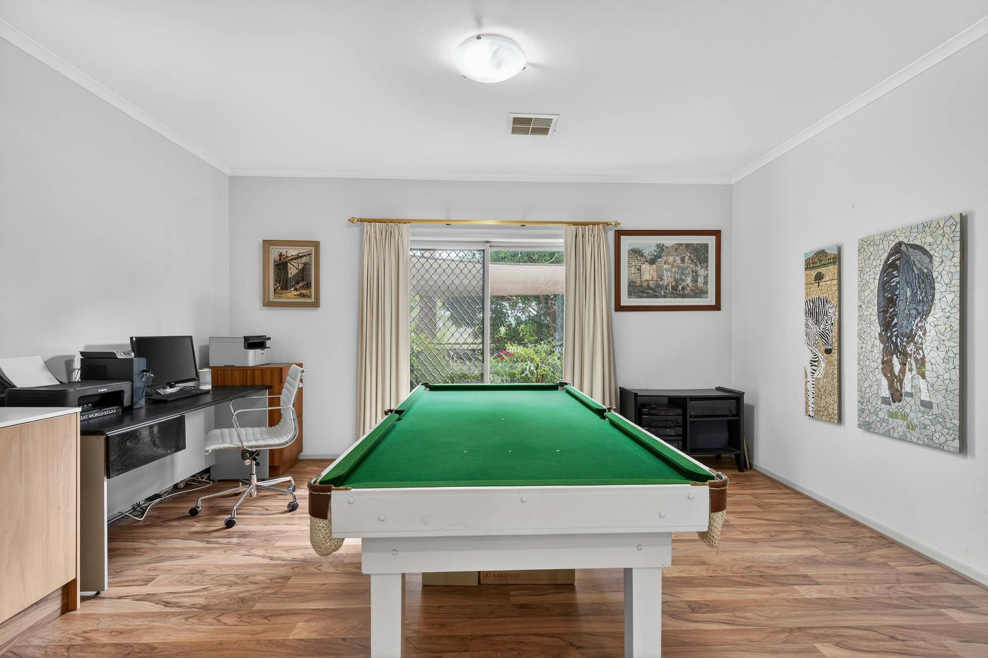 A very functional kitchen and dining area where the family can converse over a meal that has been prepared in the very spacious and well-appointed kitchen. Opposite is a billiard room, and further on is the casual living area that has glass sliding door access to a large deck where you can enjoy the peacefulness of the birds chirping and scenic views to the treed hills beyond.