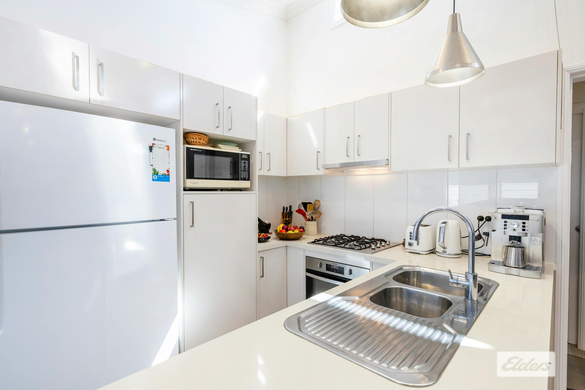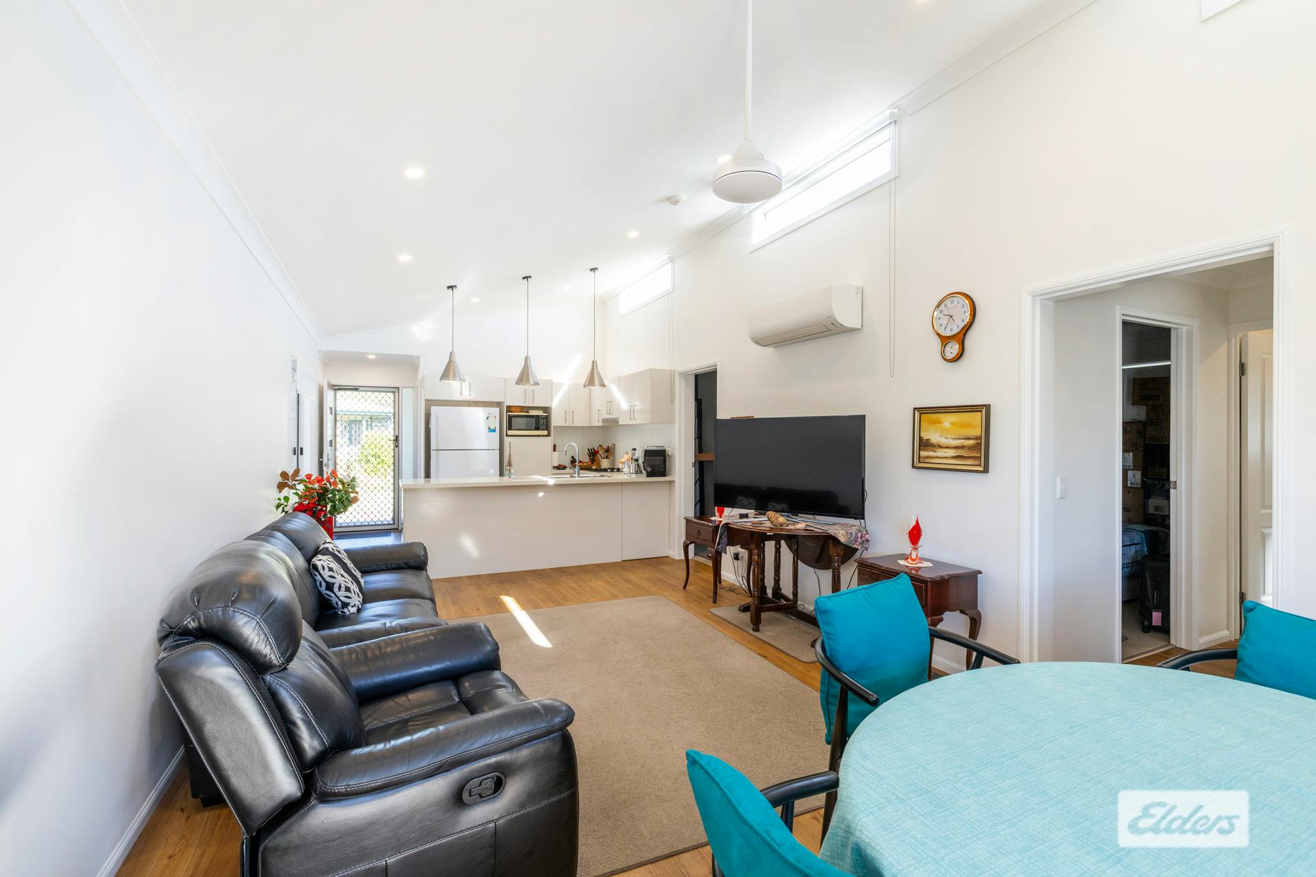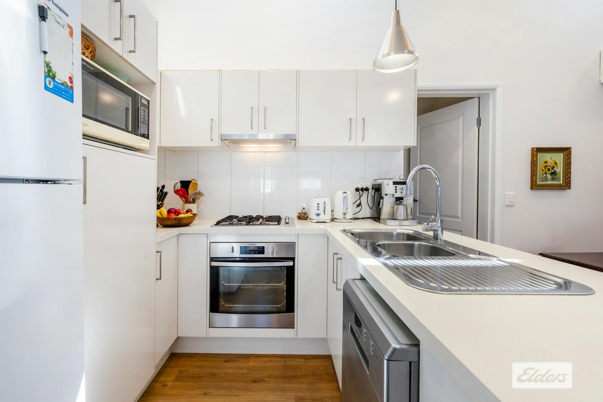 The contemporary kitchen features Caesarstone benchtops, stainless steel appliances, dishwasher and gas cooking, flowing seamlessly into the open living and dining space. Split-system air conditioning, ceiling fans and LED lighting provide year-round comfort.