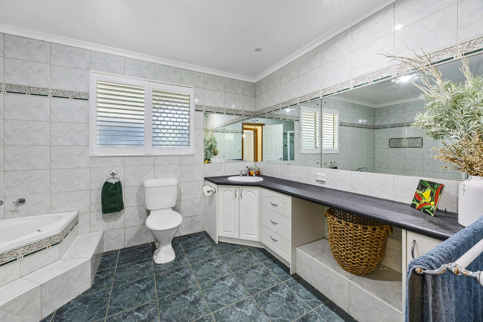 The main bathroom offers both functionality and indulgence with a separate shower and spa bath, perfect for unwinding after a day spent on the water.