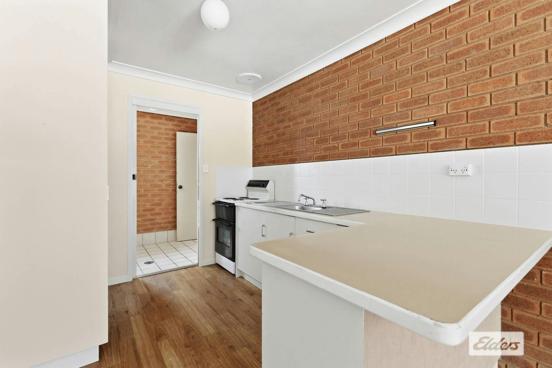 The kitchen has an electric cooktop with plenty of bench space and cabinetry.
