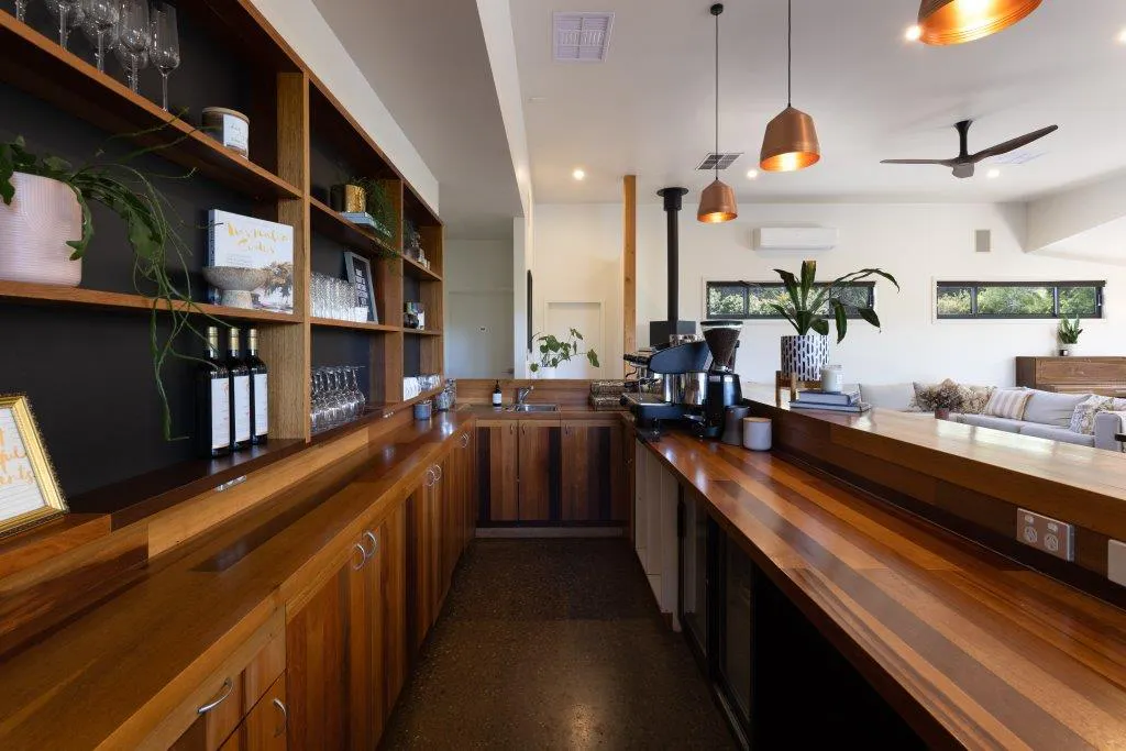 The commercial space includes a generous dining area with polished concrete floors, bar, Euro fireplace and reverse cycle heating/cooling, flowing to a large covered outdoor entertaining area complete with two three-door bar fridges. A substantial storage and food preparation room incorporates a commercial-sized cool room, complemented by office, laundry and amenities.