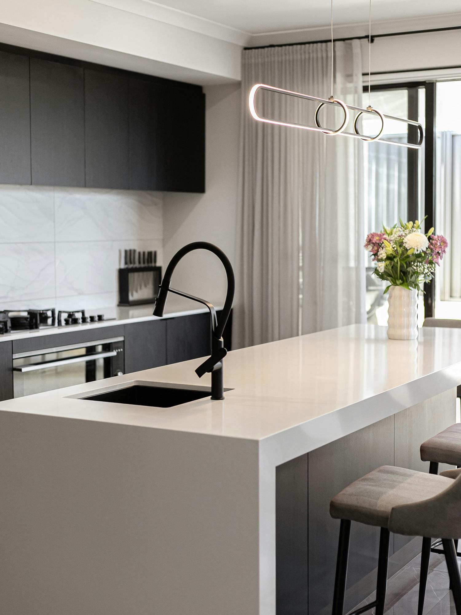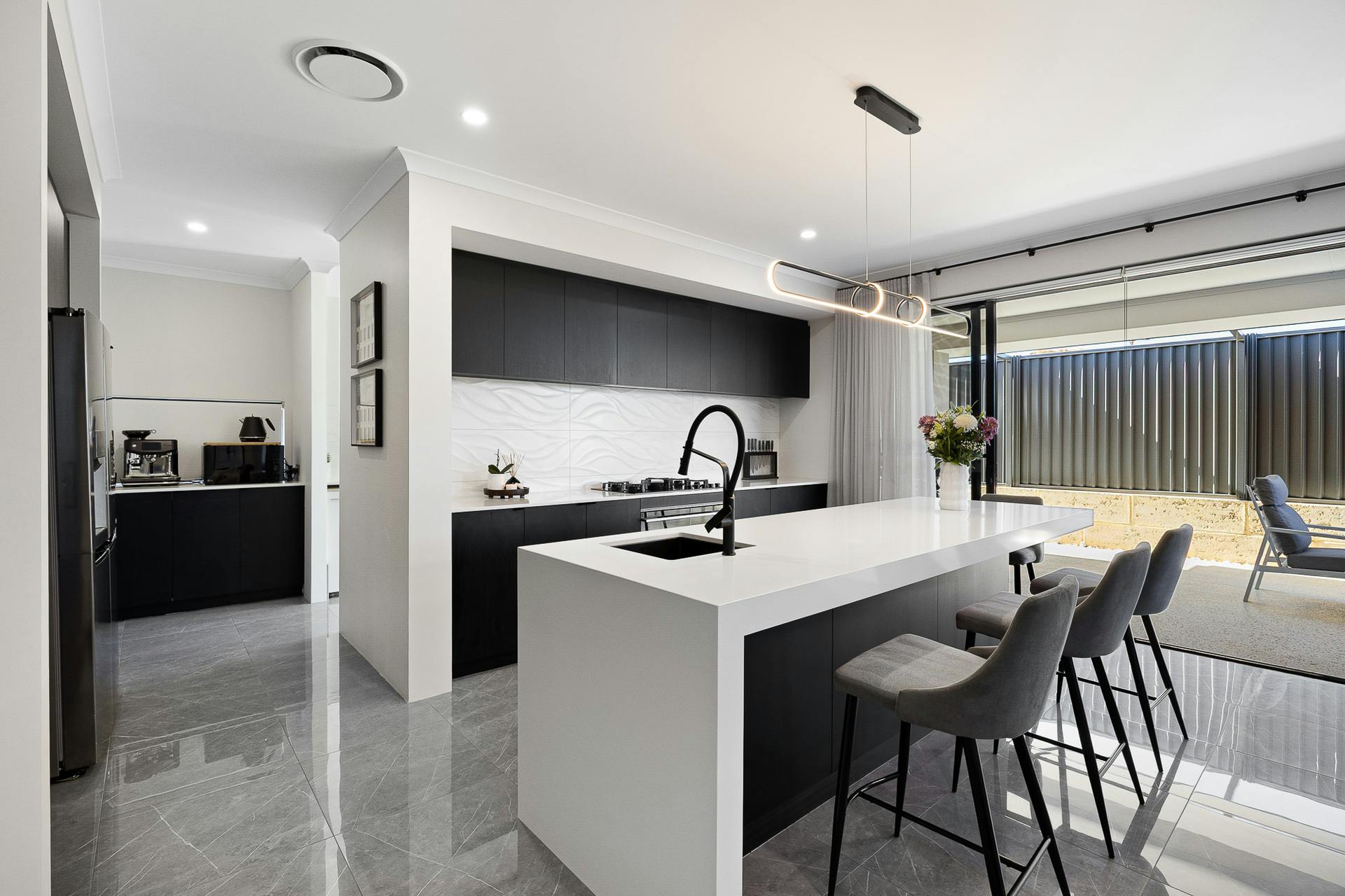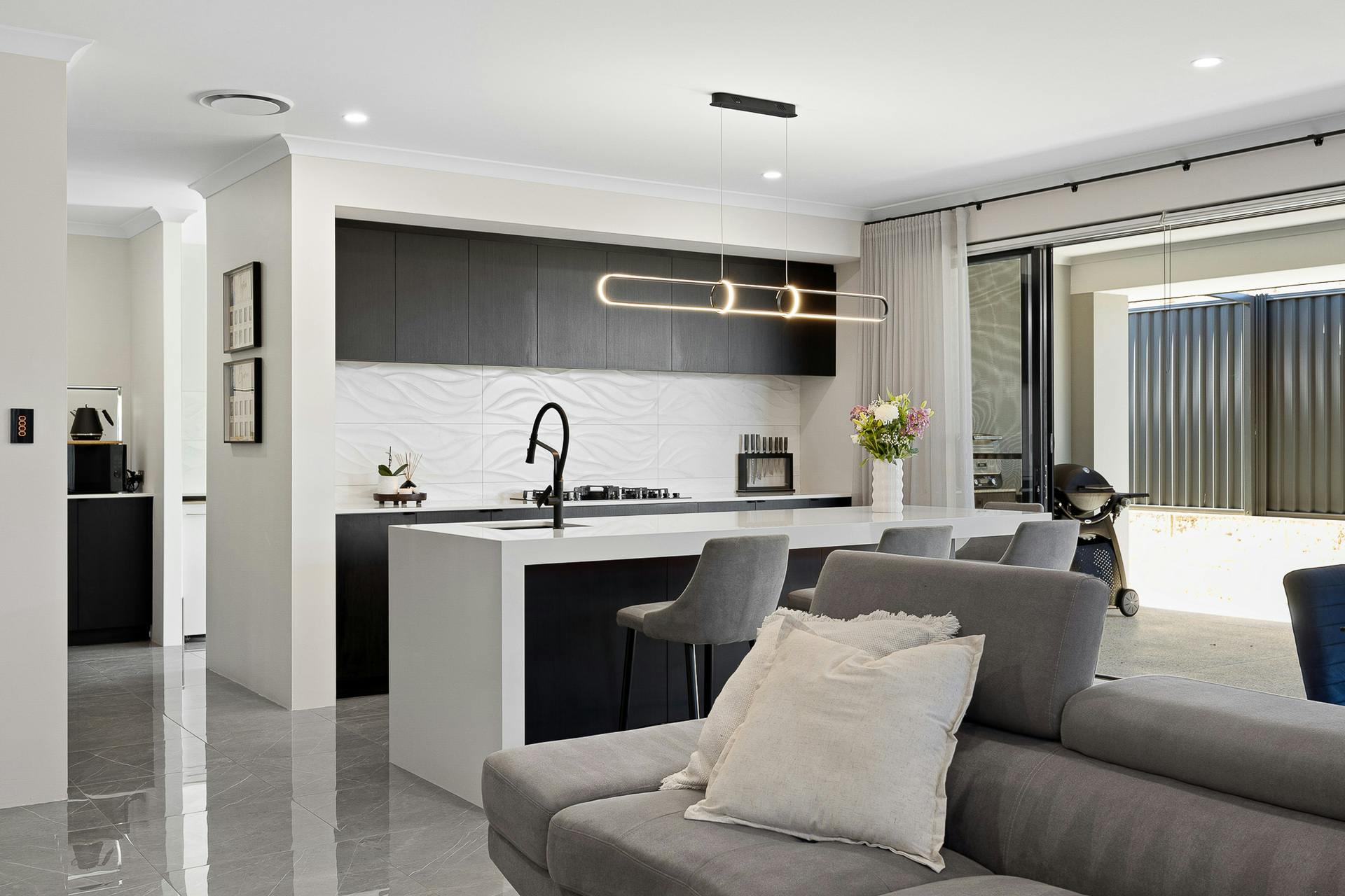 - Fully equipped kitchen, with integrated cabinetry and appliances for a seamless feel, incorporating a 900mm* oven and gas cooktop, plus a large island bench for breakfast bar dining, with a waterfall edge and striking pendant lighting