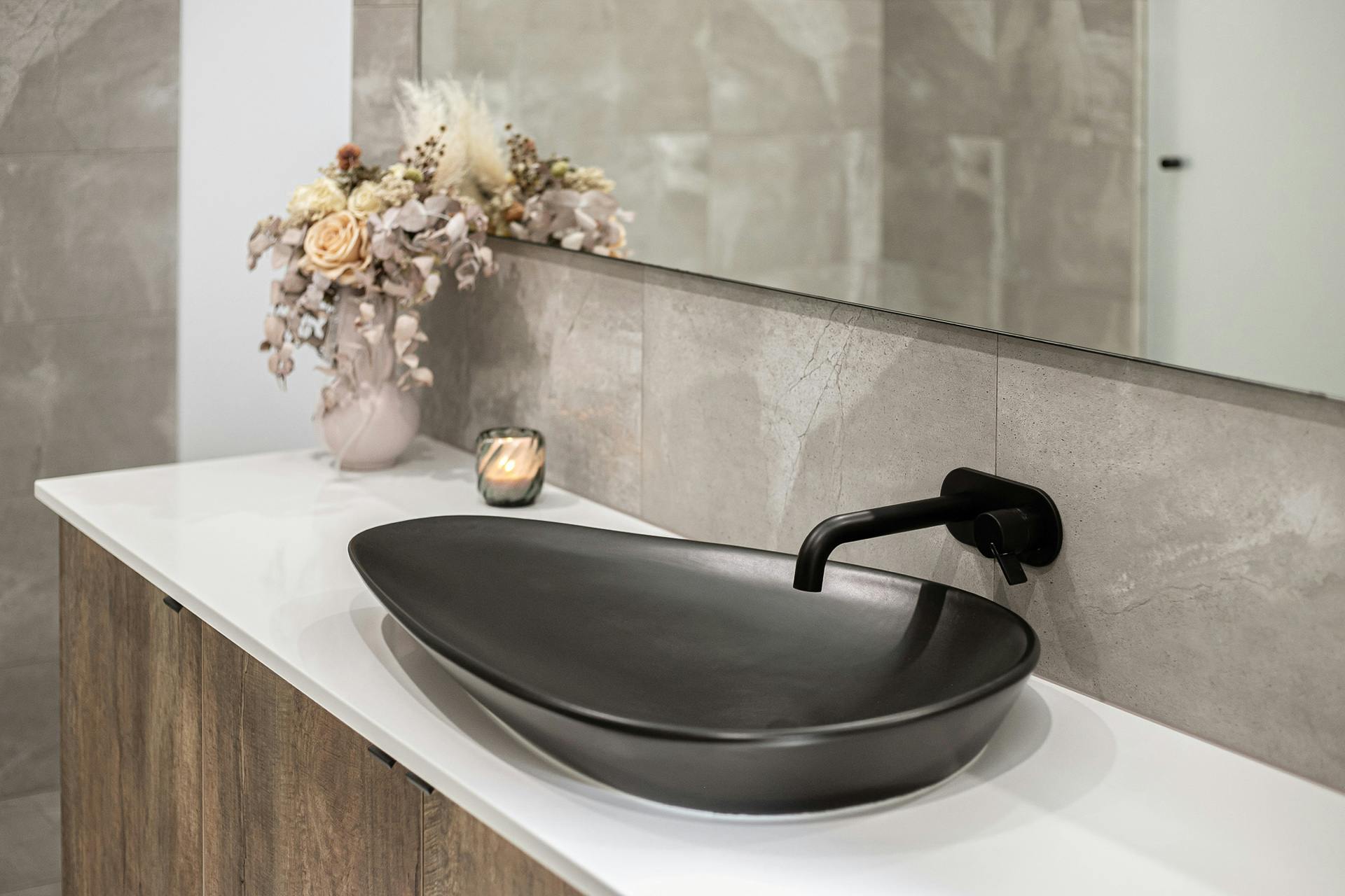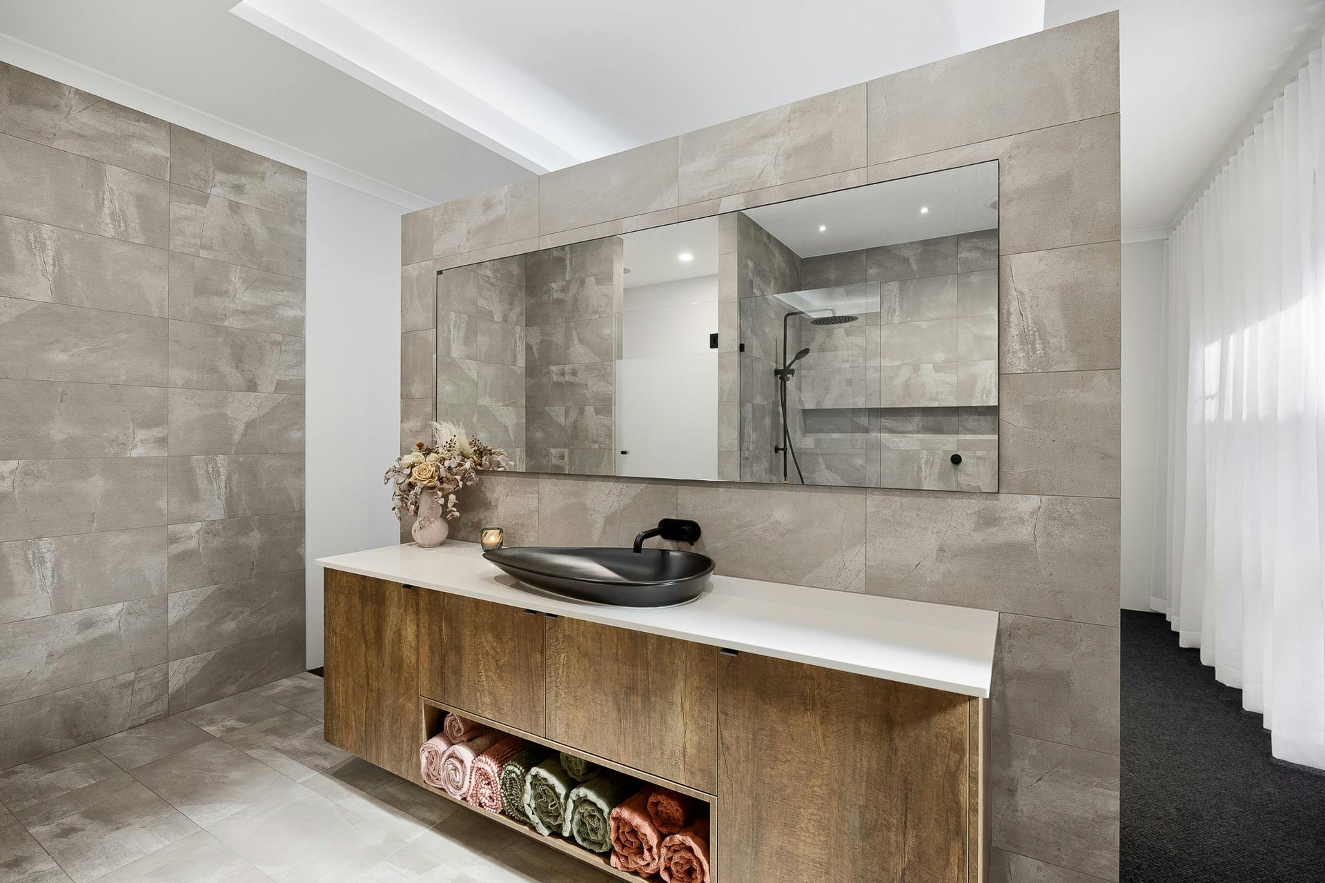- Resort inspired ensuite, with a dual walk-in shower including a recessed niche, a large stone topped vanity with an overmount sink, and a private WC, with floor to ceiling tiling for a luxe effect