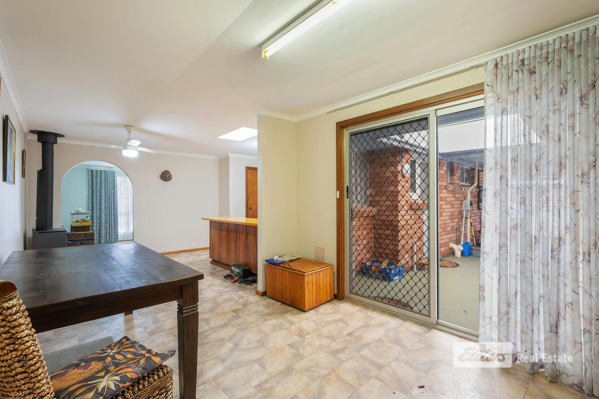 • Open-concept dining and living space, cosy wood stove