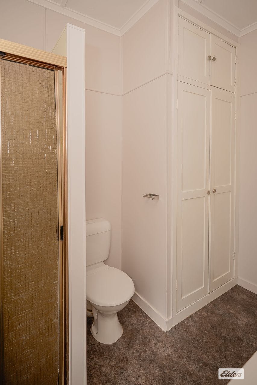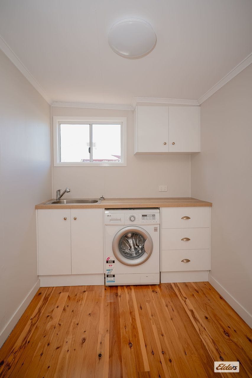 The kitchen adjoins the living area and features ample bench and cupboard space, along with a practical island bench with seating for two. The main bathroom includes a shower, vanity with storage, and toilet. The renovated laundry offers additional bench and cupboard space, accommodates the washing machine, and provides convenient external access.