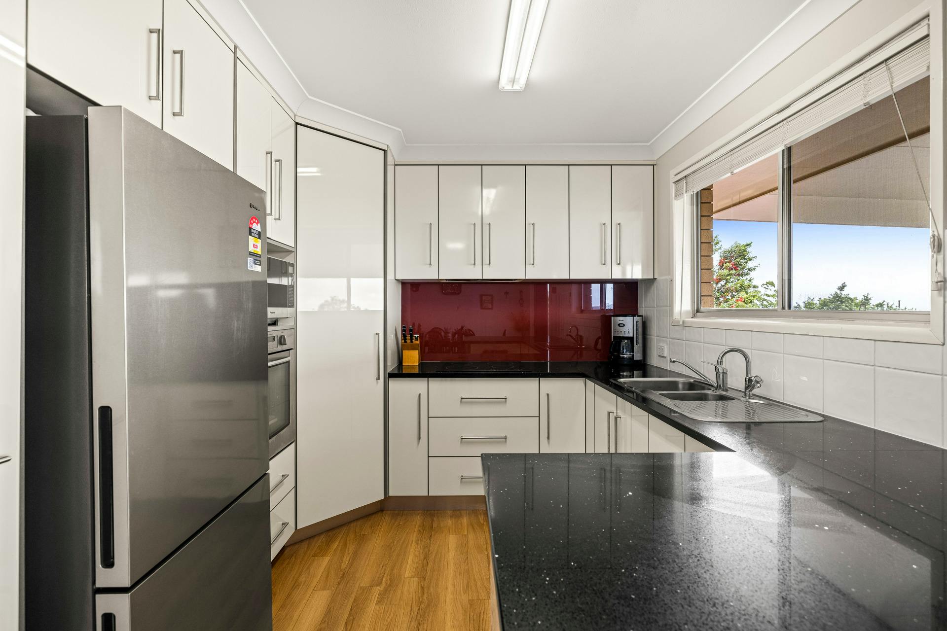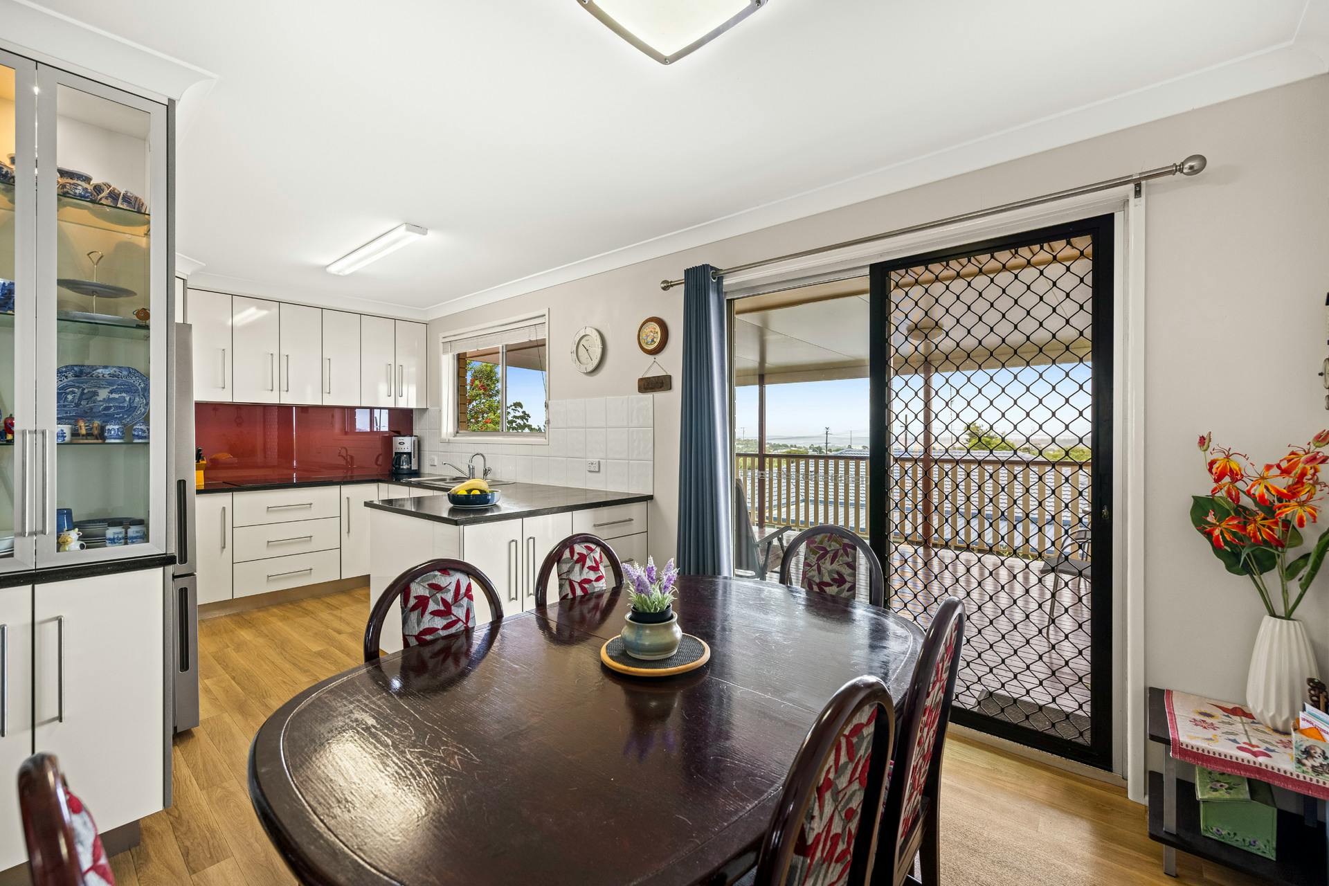 The timeless kitchen is finished in White cabinetry and Black Granite bench tops with the contrasting burgundy glass splash back, and appointed with an electric wall oven, induction cooktop, a large pantry and secondary pull out pantry, and there is the provision for a dishwasher to be installed if you wish. A beautiful backlit display cabinet is a nice feature of the kitchen, although it can't complete with the stunning southwestern countryside views and spectacular changing sunsets enjoyed all year round, which you'll view from the large upper rear covered deck as you relax with family and friends on this fabulous entertaining space. Just a few appetizing sunset shots are provided in our photo carousel for your appreciation of many more to come.
