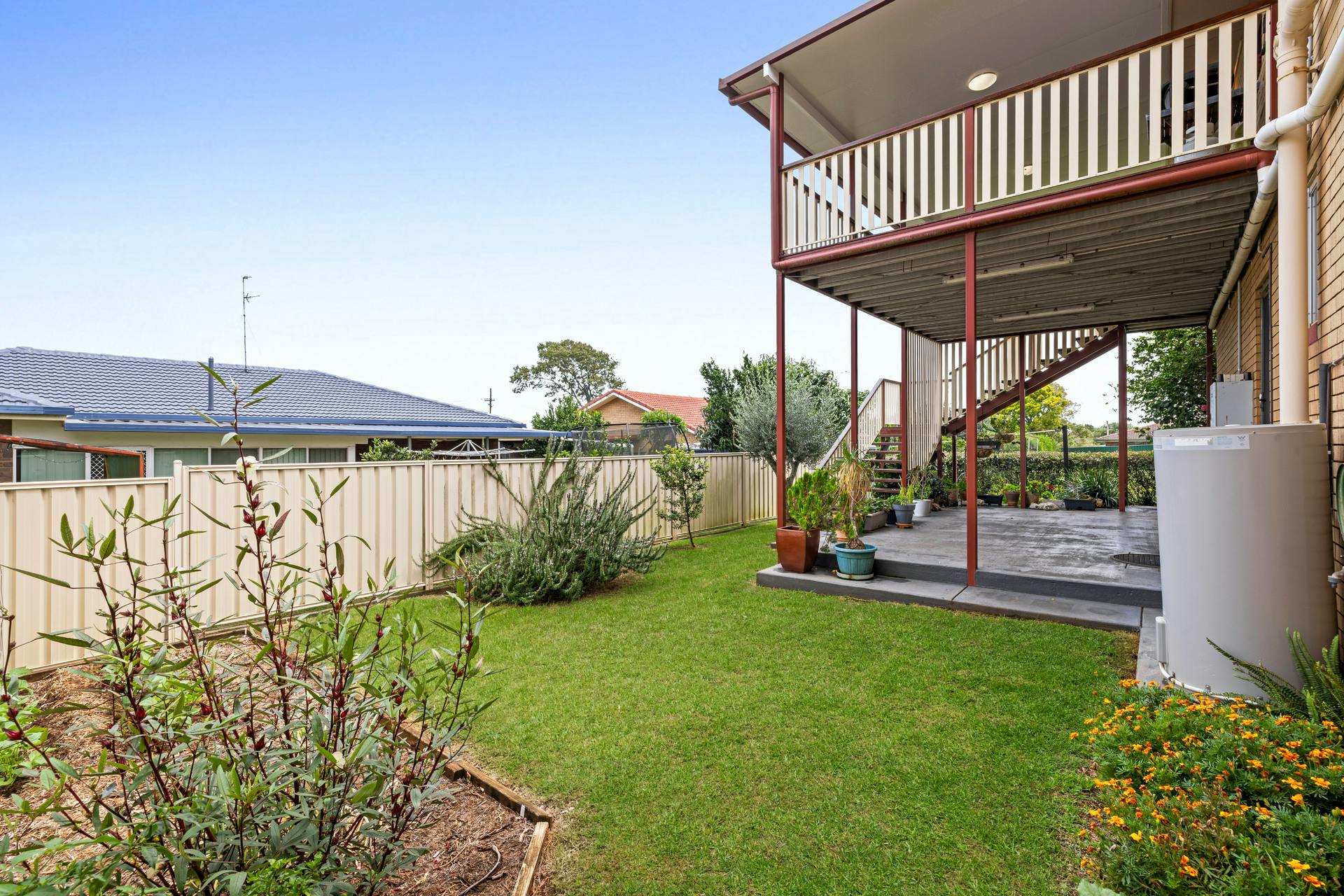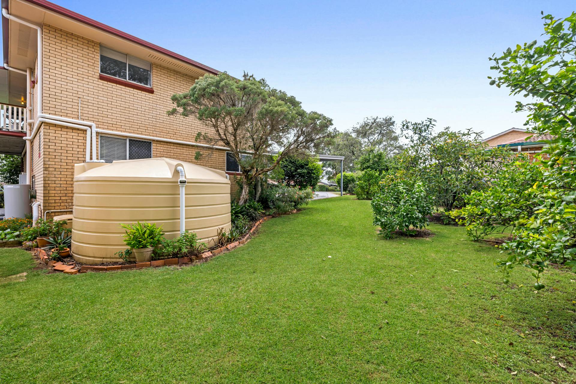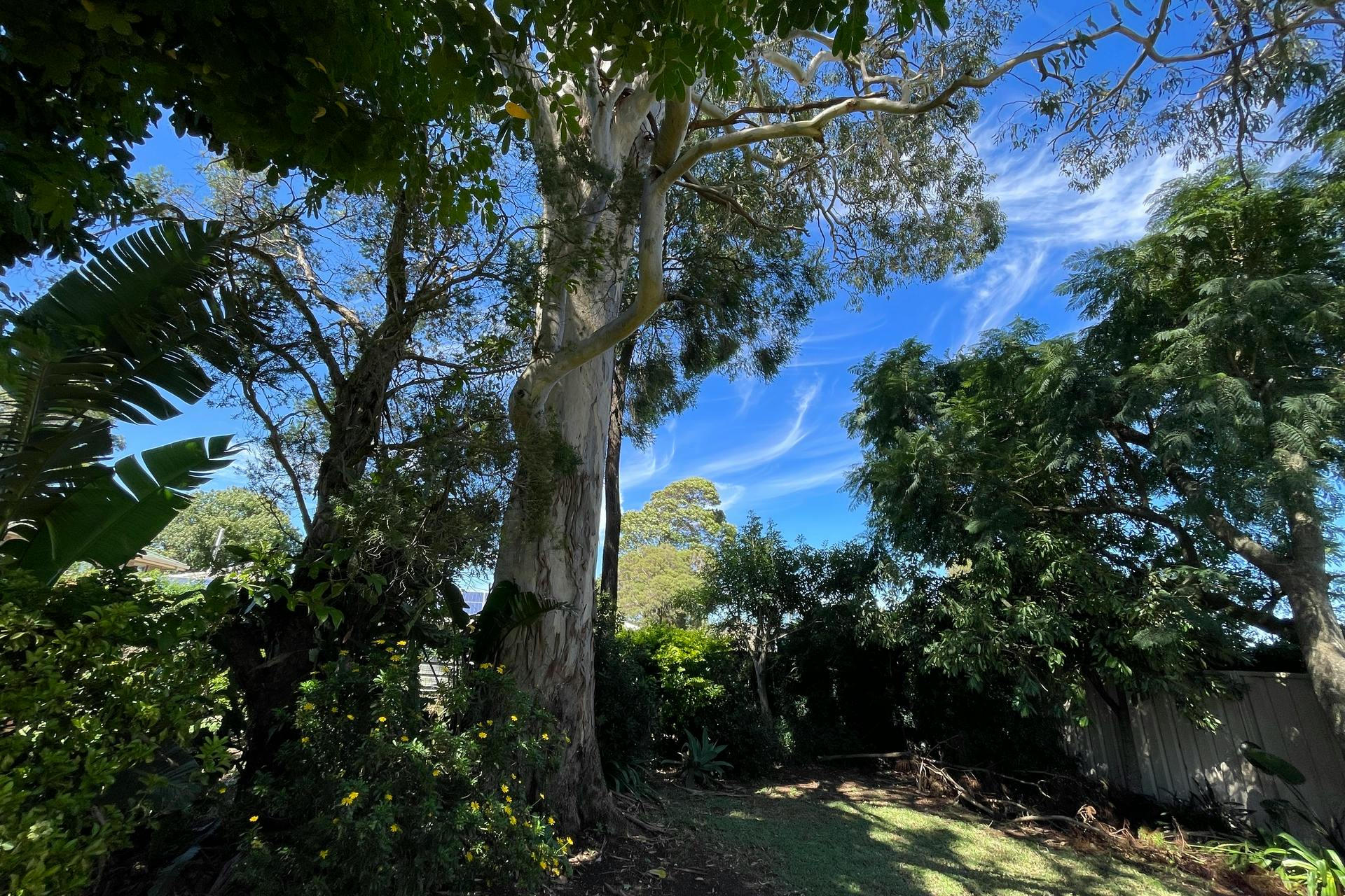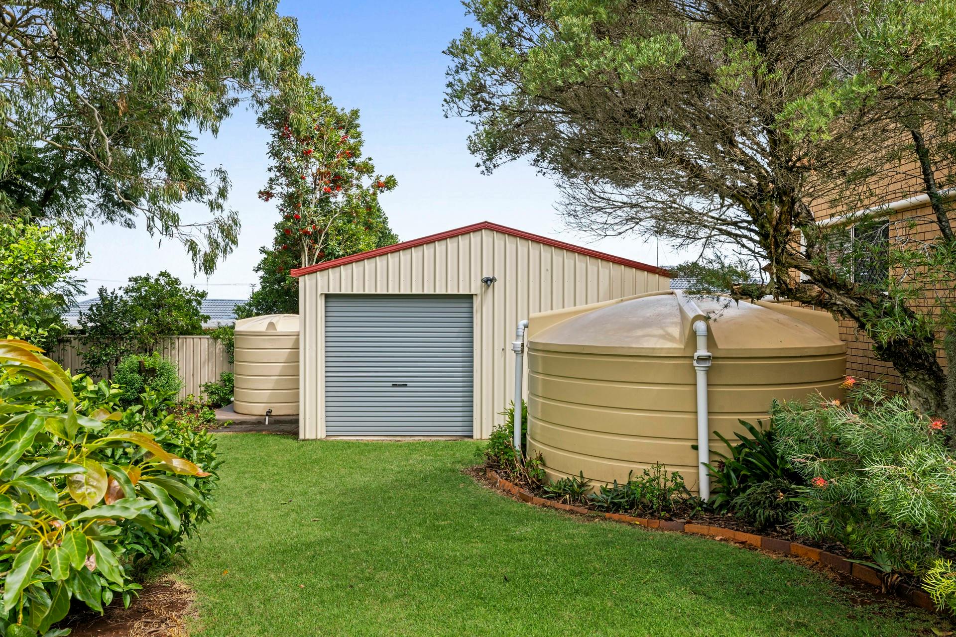 The house yard, lawns and gardens with colorful shrubs, fruit trees are beautiful, and the grand gum tree provides beautiful back yard shade in the summer. Rosellas, Tawny Frogmouths and Finches frequent the garden and trees.