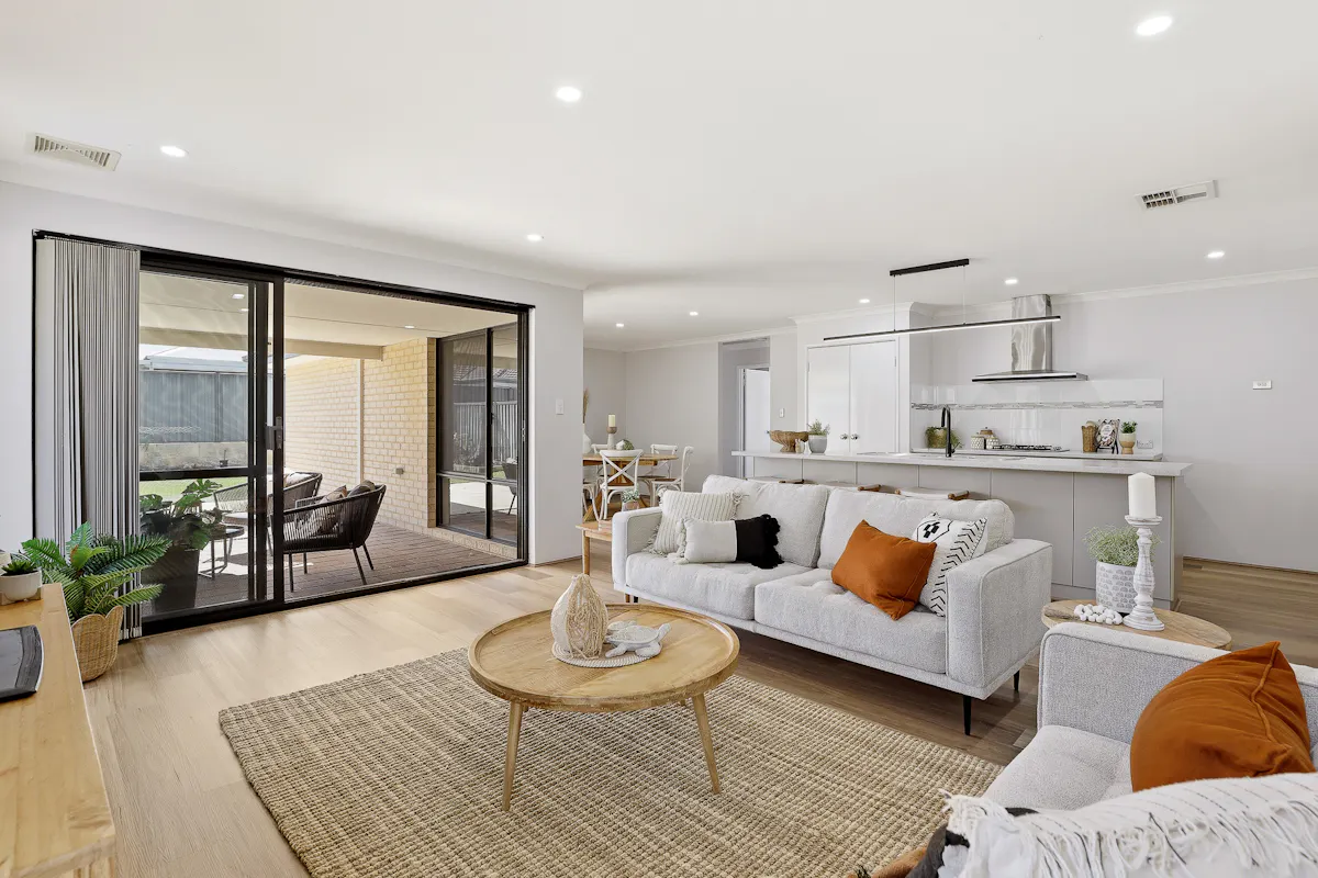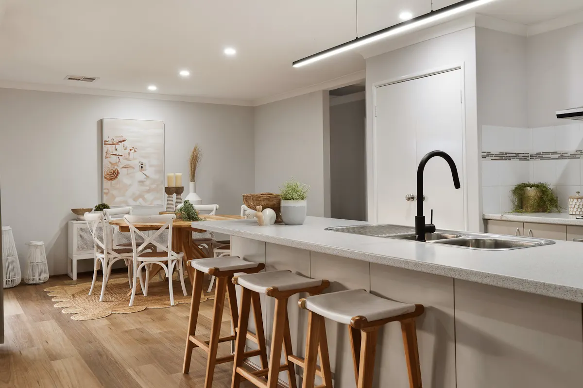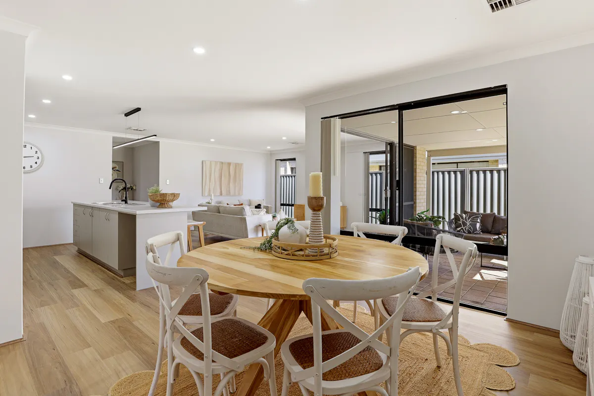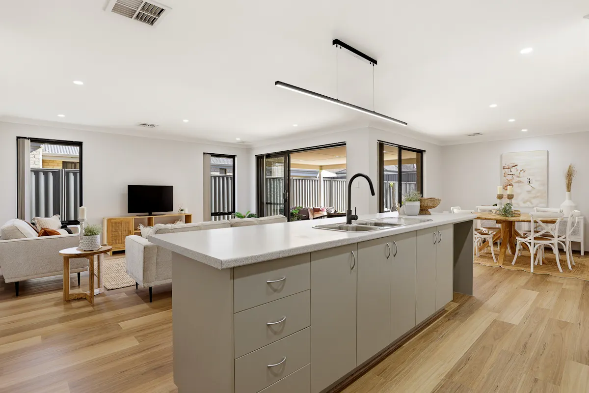 - Zoned living and dining around the central kitchen, with downlighting overhead and stacking doors to open the space up to your alfresco for uninterrupted indoor to outdoor access
