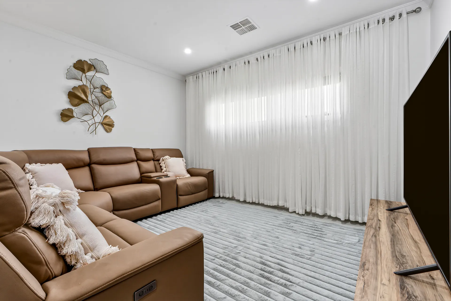 For those who love to unwind, a dedicated theatre room provides the perfect retreat. Complete with sliding doors for privacy and complemented by elegant sheer curtains, it creates a comfortable and stylish setting to enjoy your favourite shows.