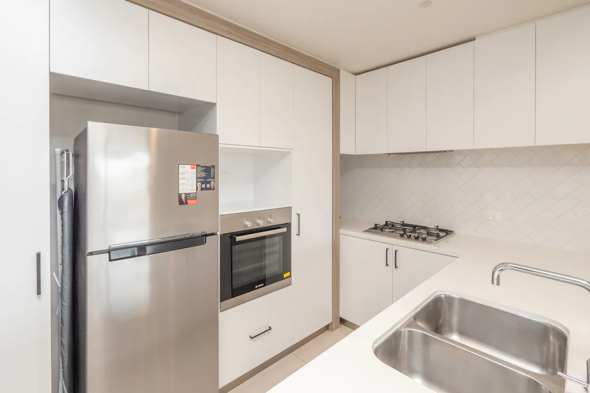 The sleek exterior welcomes you into the residence via elevator access, with firstly your modern kitchen placed to the left. Fully fitted cabinetry ensures ample storage, while the sweeping stone benchtops provide an area for casual dining and plenty of room for preparation, with quality in-built appliances to utilise. Your open plan living and dining area is light and bright for a spacious feel, with timber laminate flooring, an effective reverse cycle air conditioning unit and downlighting throughout. While a study nook is placed to the side, along with sliding door access to the balcony for a sheltered setting to relax or entertain.