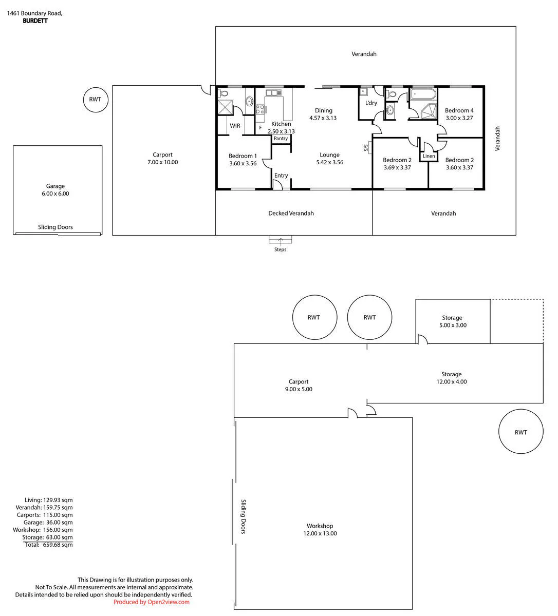 • 14m x 12m workshop, double garage & carport, sundry sheds