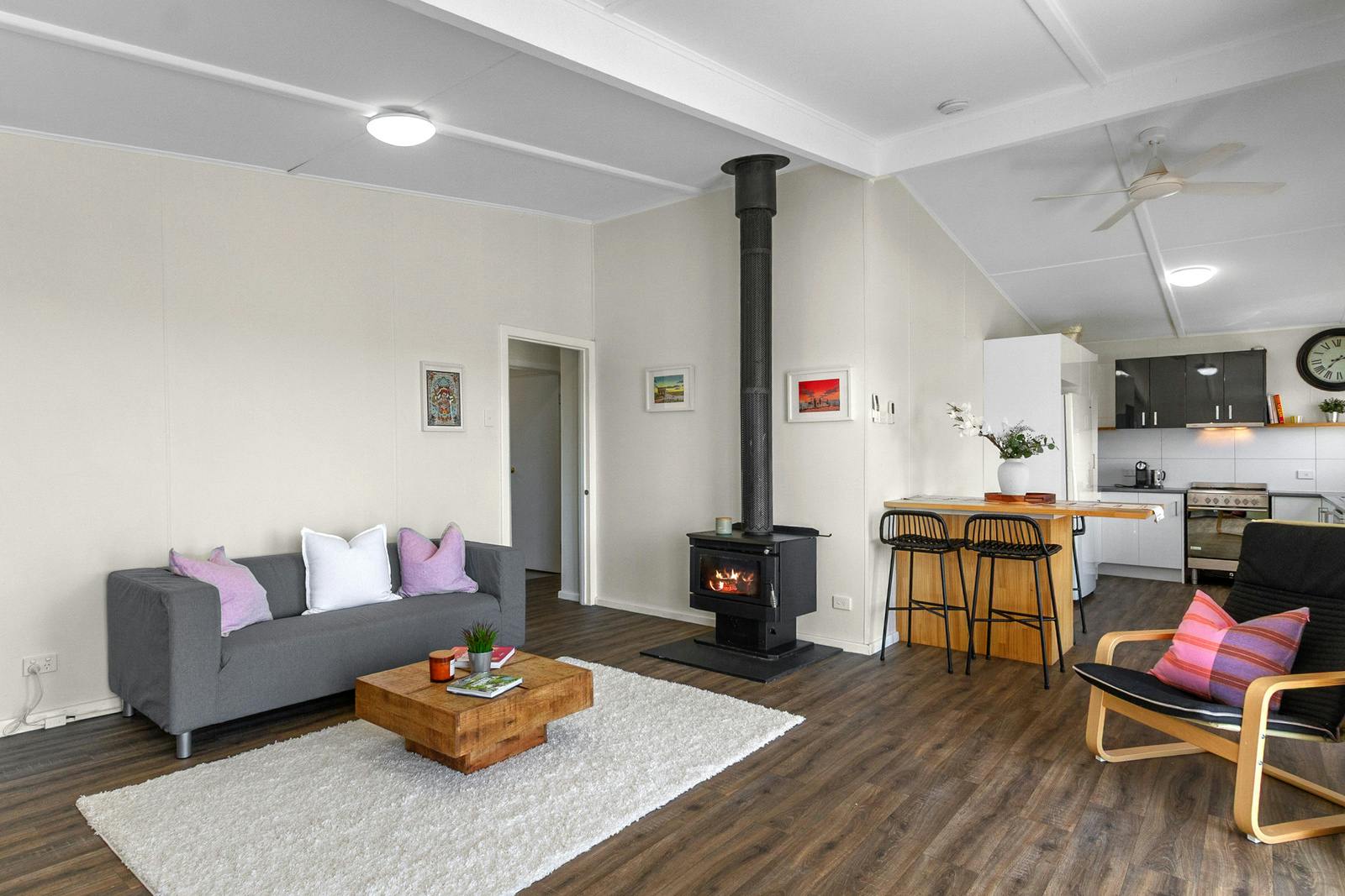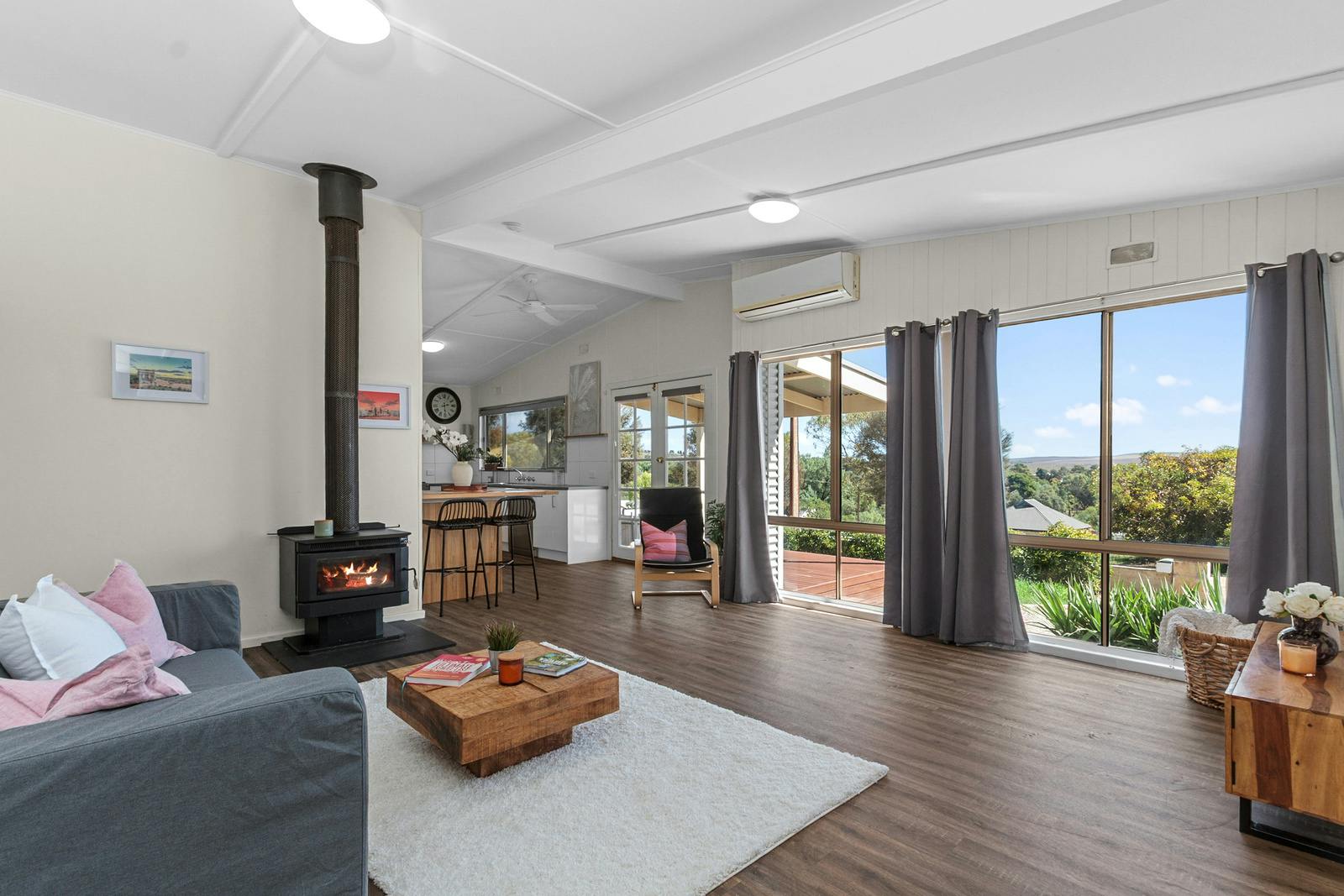 The well-appointed kitchen is both practical and welcoming, featuring ample cabinetry, a gas cooktop, electric oven, range-hood, and plenty of room for eat-in dining, perfect for family meals and country-style entertaining. The kitchen flows seamlessly into the spacious living area, complete with slow combustion heating, reverse-cycle split system air conditioning, and exposed beams that enhance the sense of height and openness.