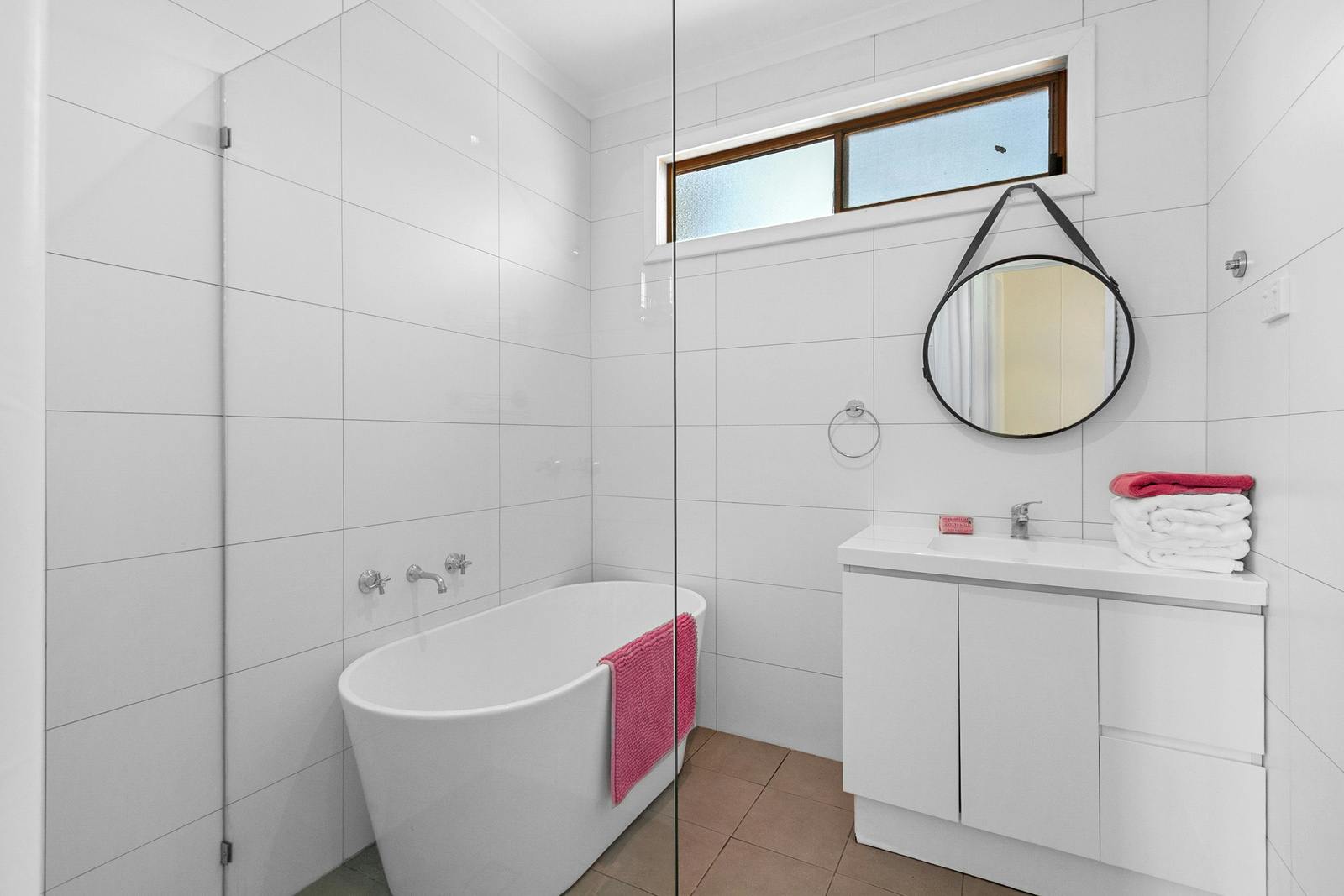• Updated bathroom with freestanding bath, shower alcove, and vanity