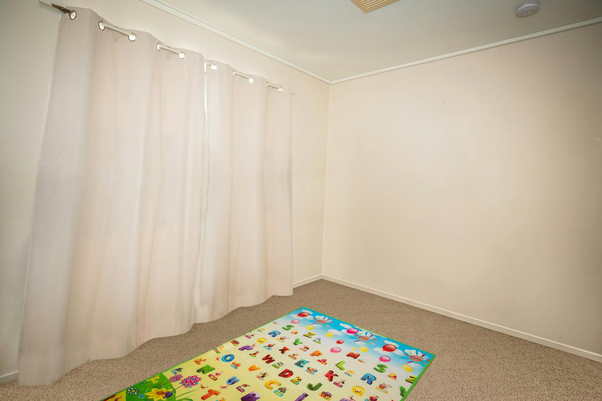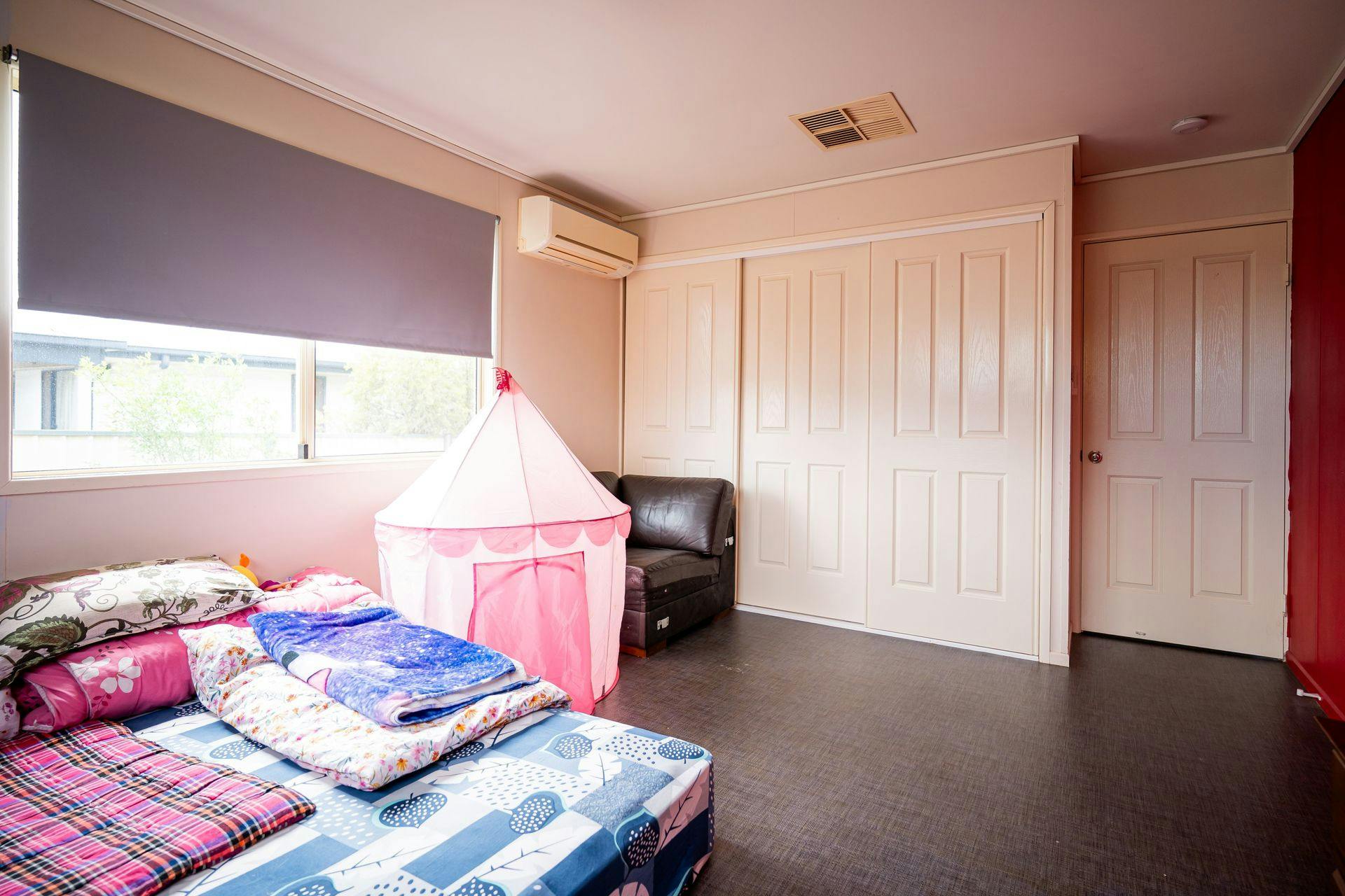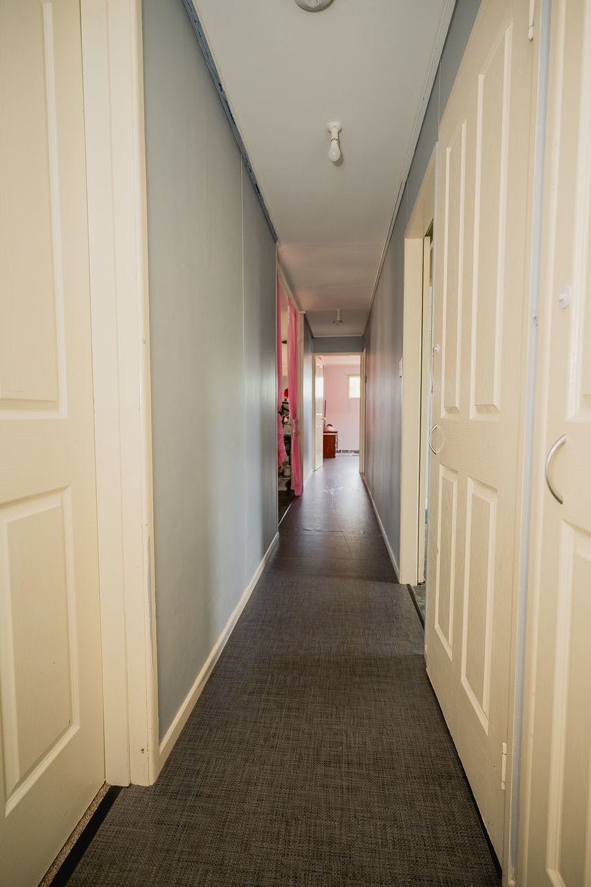The bedrooms are conveniently positioned along the hallway. The main bedroom at the front of the home features built-in cupboards, easy-maintenance lino flooring, and a split system air conditioner. Adjacent is a smaller bedroom, ideal for a home office, nursery, or single bedroom. At the rear, two carpeted bedrooms both include built-in cupboards, with one also fitted with a split system.