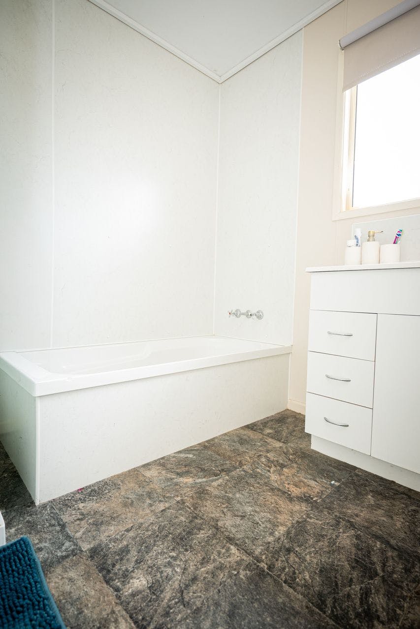 The main bathroom and laundry are located in a dedicated area of the home, separated by a door for privacy. The bathroom includes a bathtub, shower, vanity, and separate toilet. The laundry has a tub and space for both a washing machine and dryer, with an external door providing direct access to the clothesline. Additional linen cupboard storage adds practicality.
