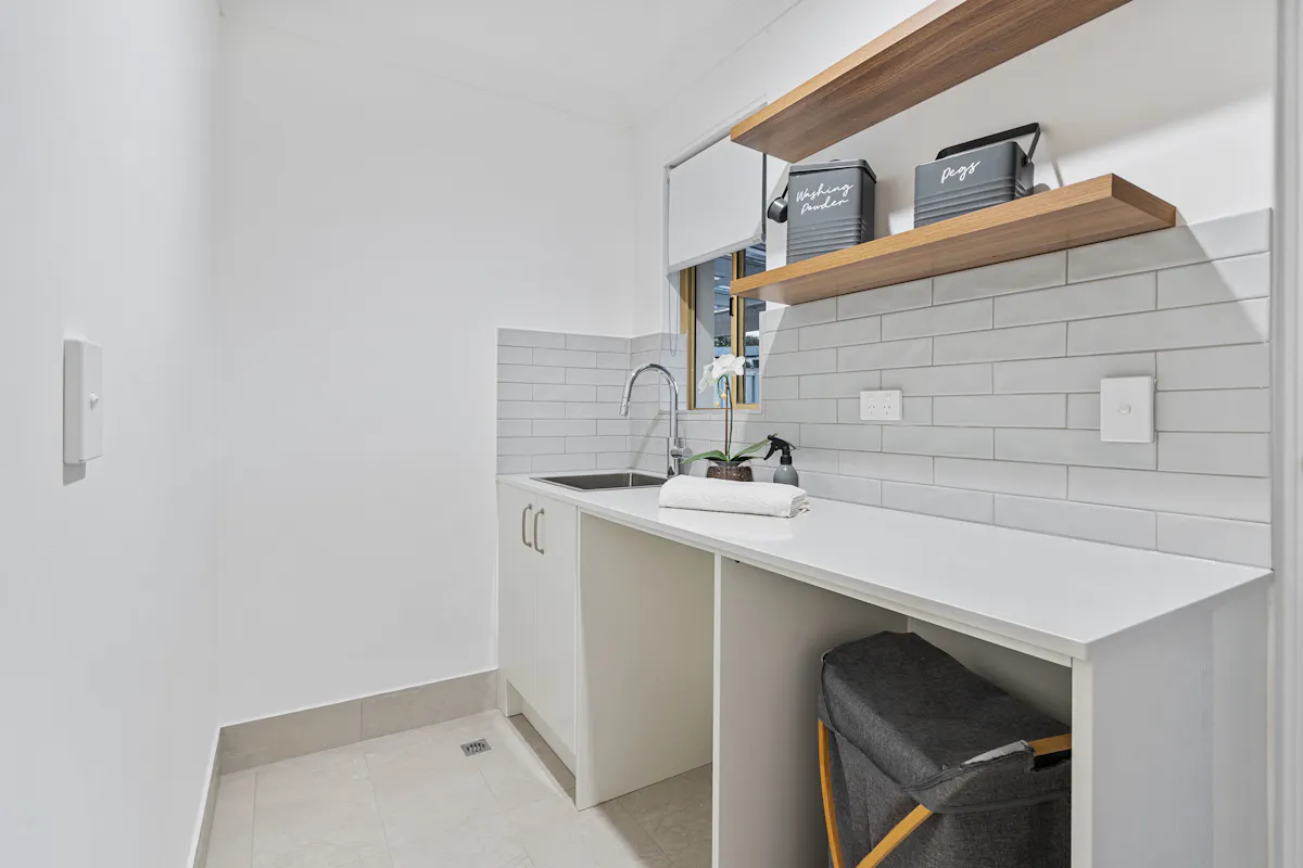 At the heart of the home is a superbly appointed kitchen, featuring a generous stone bench, quality appliances, abundant storage and a walk-in scullery/laundry.