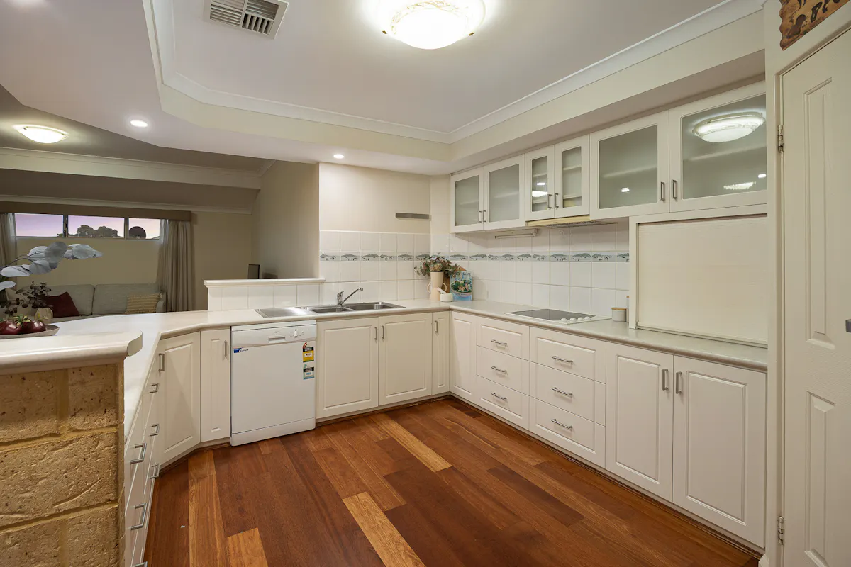 - Centrally placed kitchen, with a wraparound breakfast bar for casual meals, plus in-built electric appliances including a wall oven and cooktop, with extensive cabinetry, a handy appliance hutch and a full height pantry for storage
