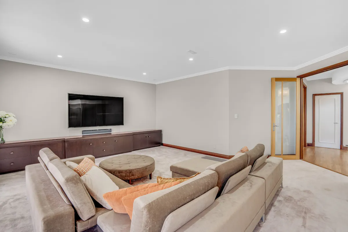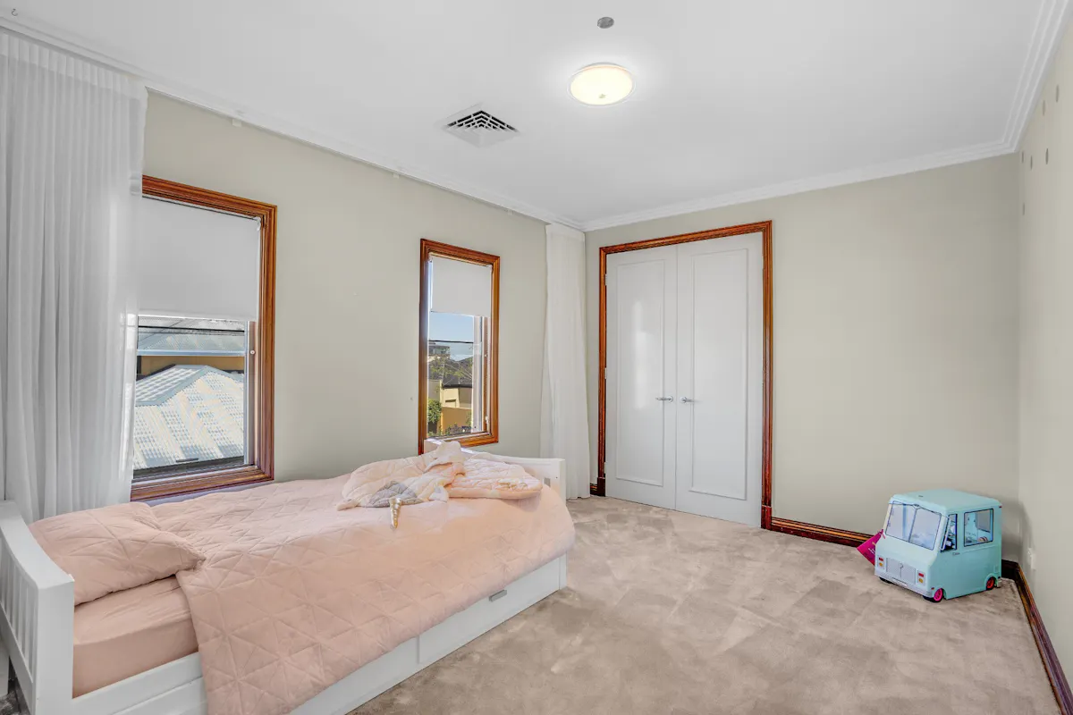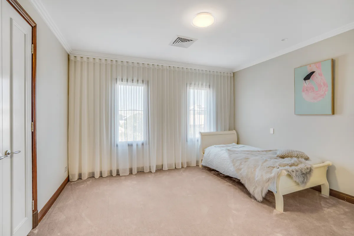 The Roman sized master suite is simplistic yet sophisticated featuring extensive bifold Jarrah doors to a large private balcony, spoilt with uninterrupted views of the harbour. Curved walls set a contemporary mood in the deluxe ensuite while large oak-framed mirrors reflect the his-and-her vanities on each side of the room separated by a large oval spa bath. The luxurious minor bedrooms are extremely generous in size and feature soft furnishings, double-hung windows adorned with Cedar venetians and large walk-in-robes reducing clutter and allowing for easy living.