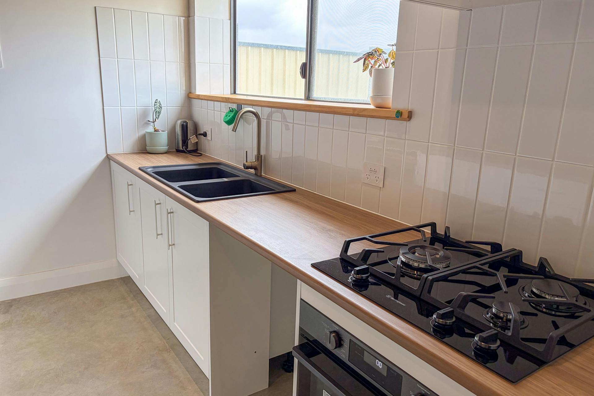 - Kitchen includes a gas stove, double sink, various sized cupboards, and sections for a large fridge and dishwasher