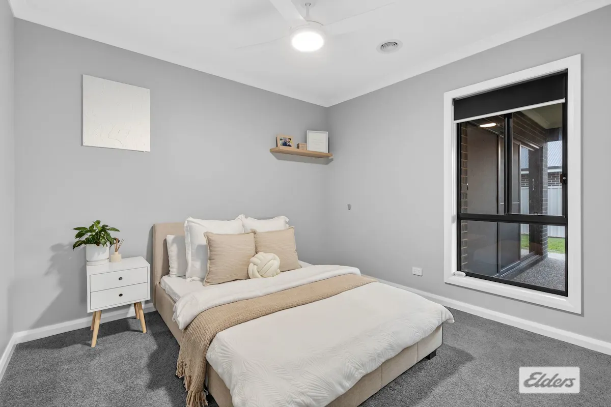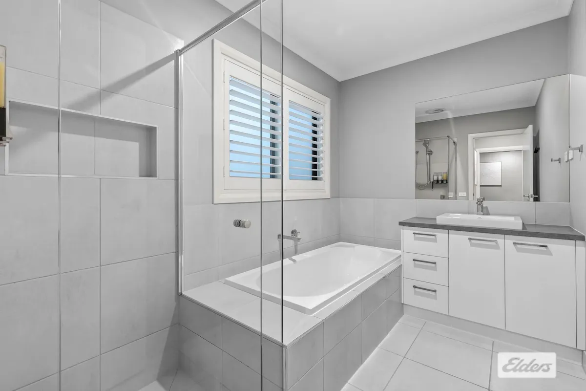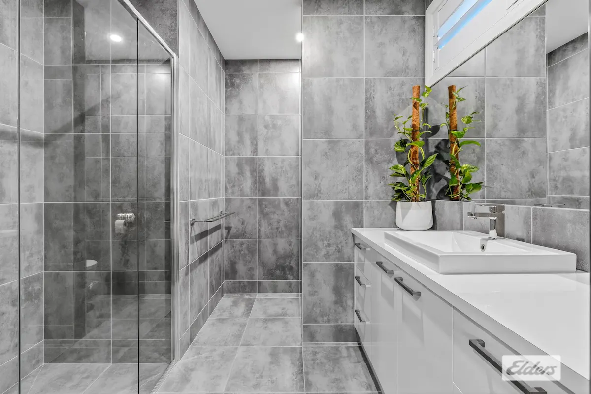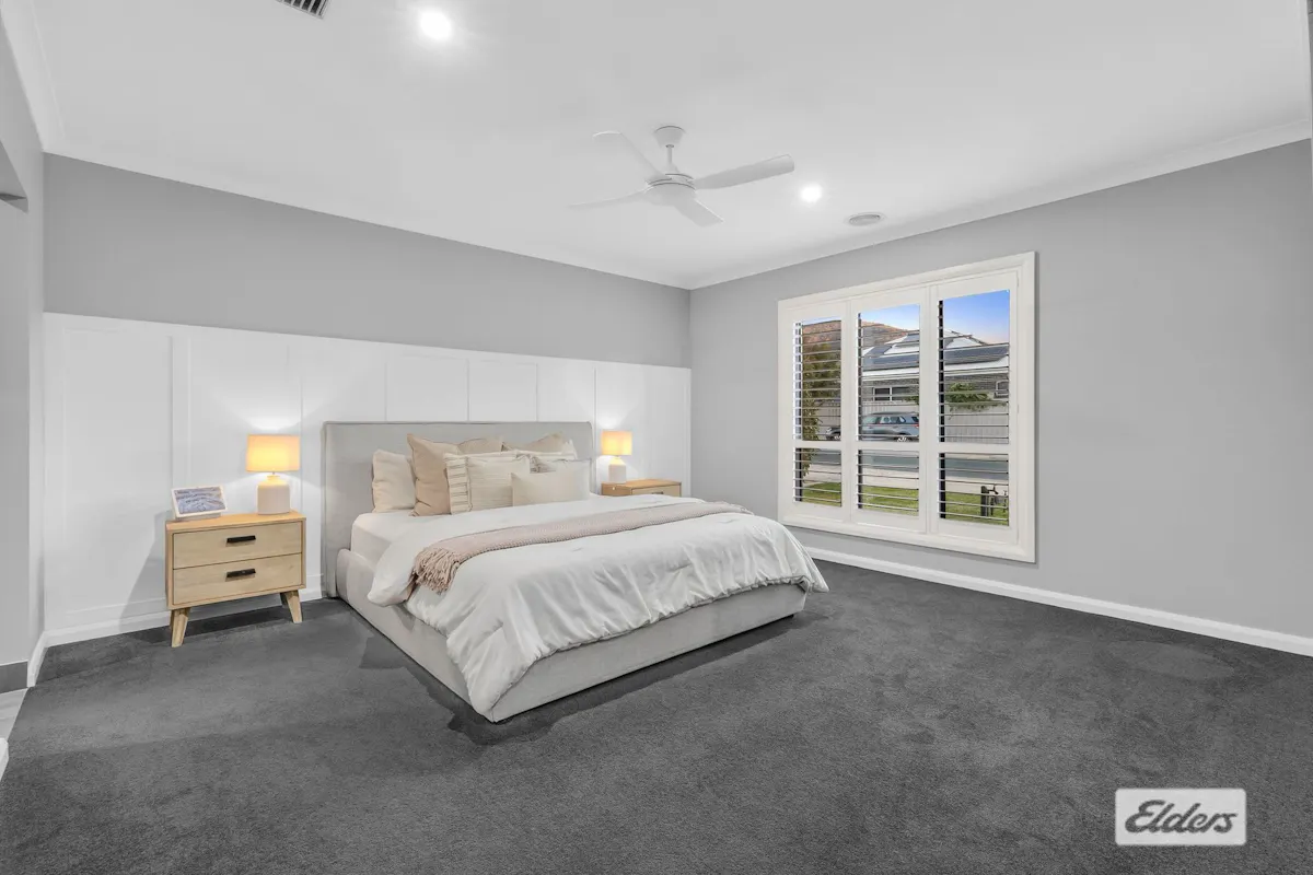 The master suite is privately positioned at the front of the home, beautifully appointed with plantation shutters, a ceiling fan, and a stunning dado feature wall. The spacious walk-in robe is a true standout – a dream setup – while the ensuite impresses with floor-to-ceiling tiles and a refined finish.