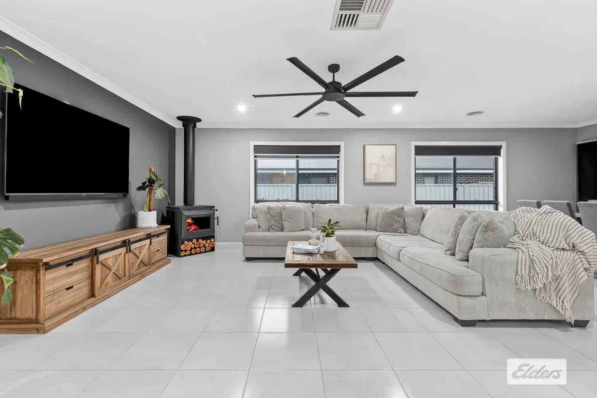 At the heart of the home, the light-filled kitchen overlooks the meals and living space, complete with a 900mm gas freestanding oven, dishwasher and ample storage. A striking slow combustion fireplace and oversized feature ceiling fan create a warm and inviting atmosphere, perfect for year-round comfort.