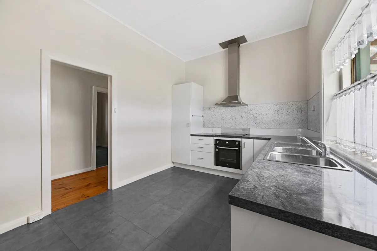 The front of the home provides a comfortable lounge where a slow combustion heater creates a cosy atmosphere in winter, while a split system air conditioner ensures year-round comfort. This leads to the heart of the home is a modern eat-in kitchen featuring electric appliances.