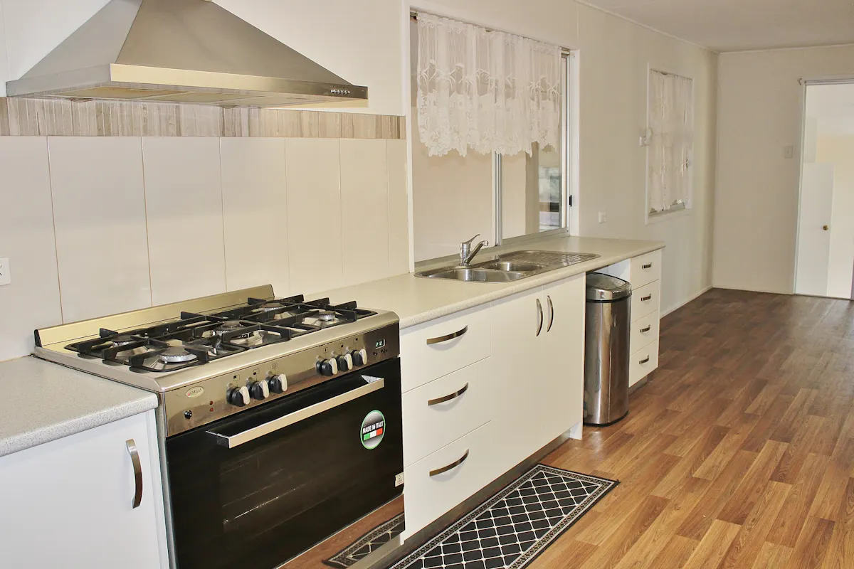 - Modern kitchen with impressive S/S 900m stove with 5x burner gas top, electric oven & canopy rangehood