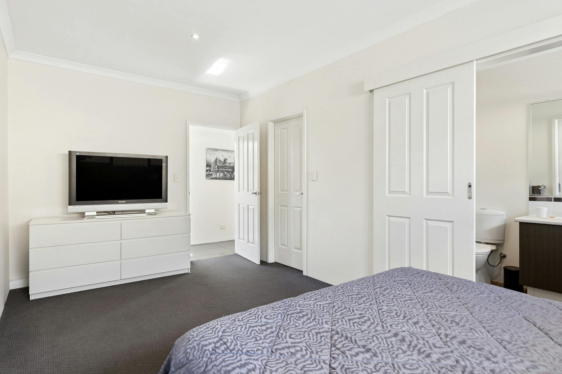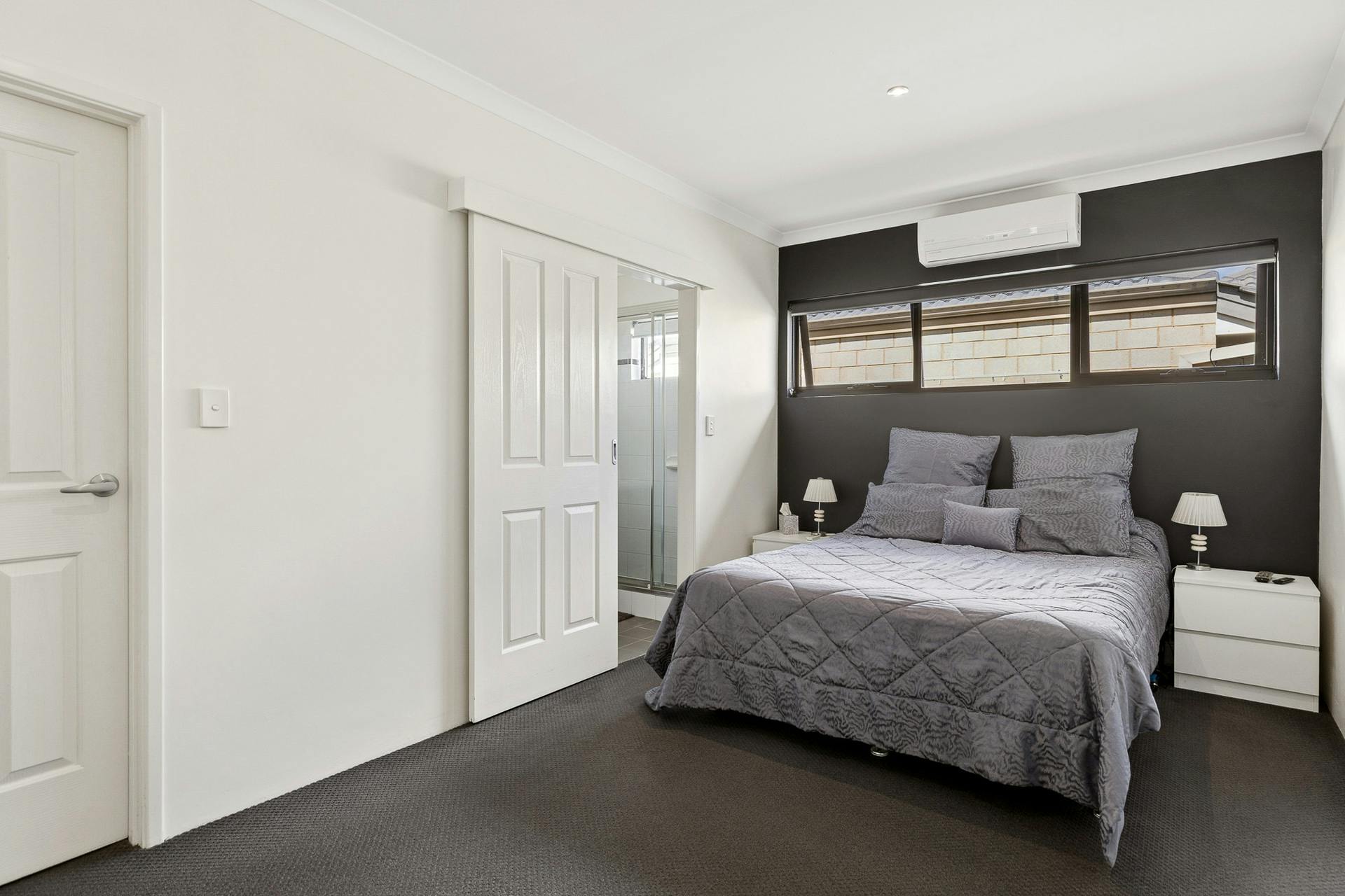 The master bedroom provides a comfortable retreat and features a statement feature wall, darker toned carpet for warmth, reverse cycle air conditioning, a walk-in wardrobe, and sliding door access to the ensuite.