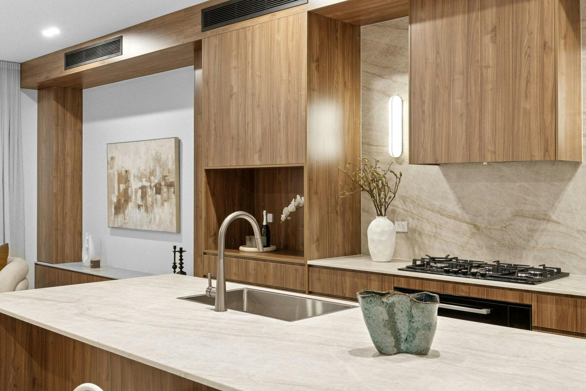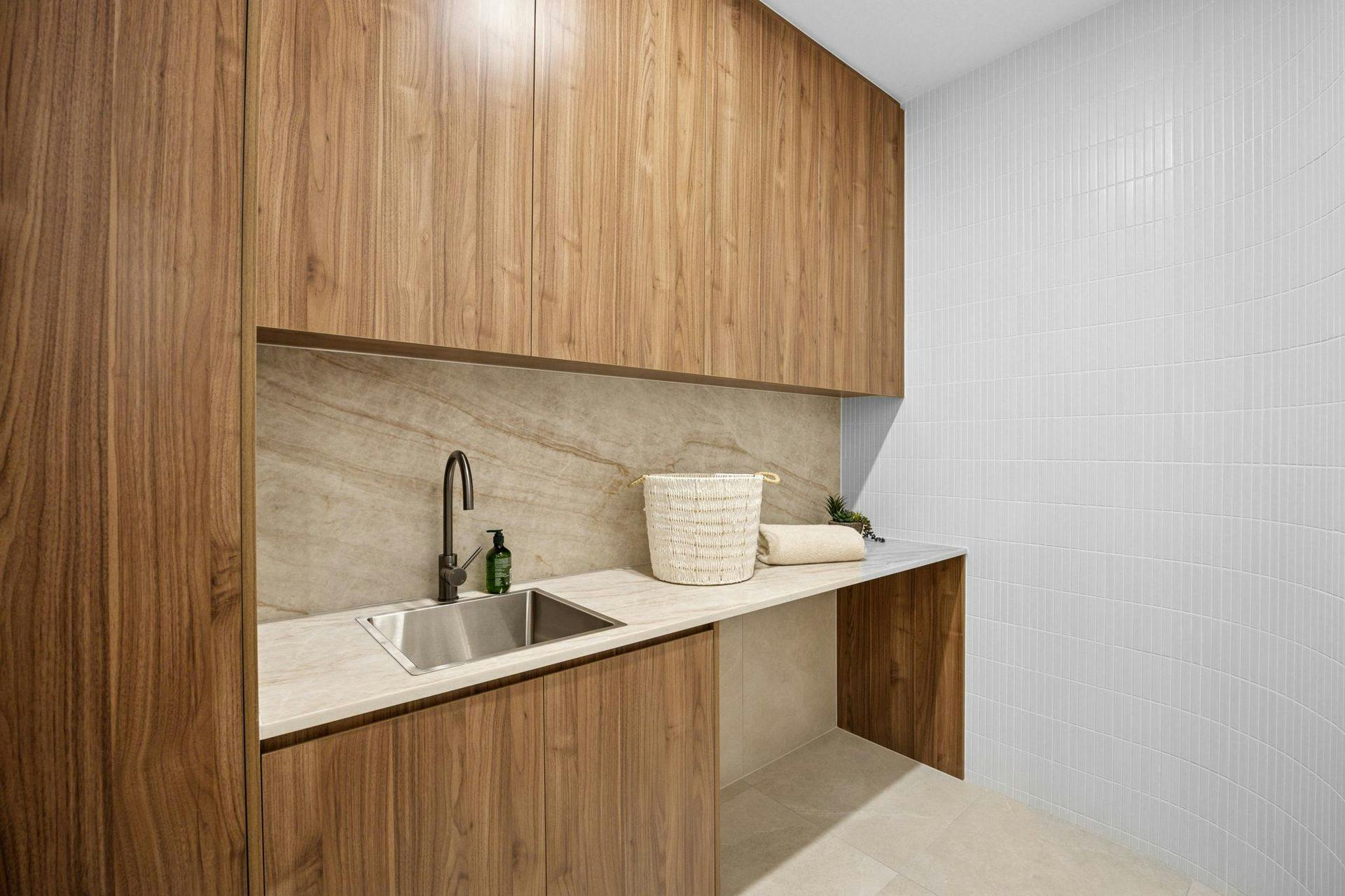 At the heart of the home, a grand open plan kitchen, living and dining area is designed to impress. The kitchen is fitted with premium stone surfaces, integrated appliances and a walking pantry.