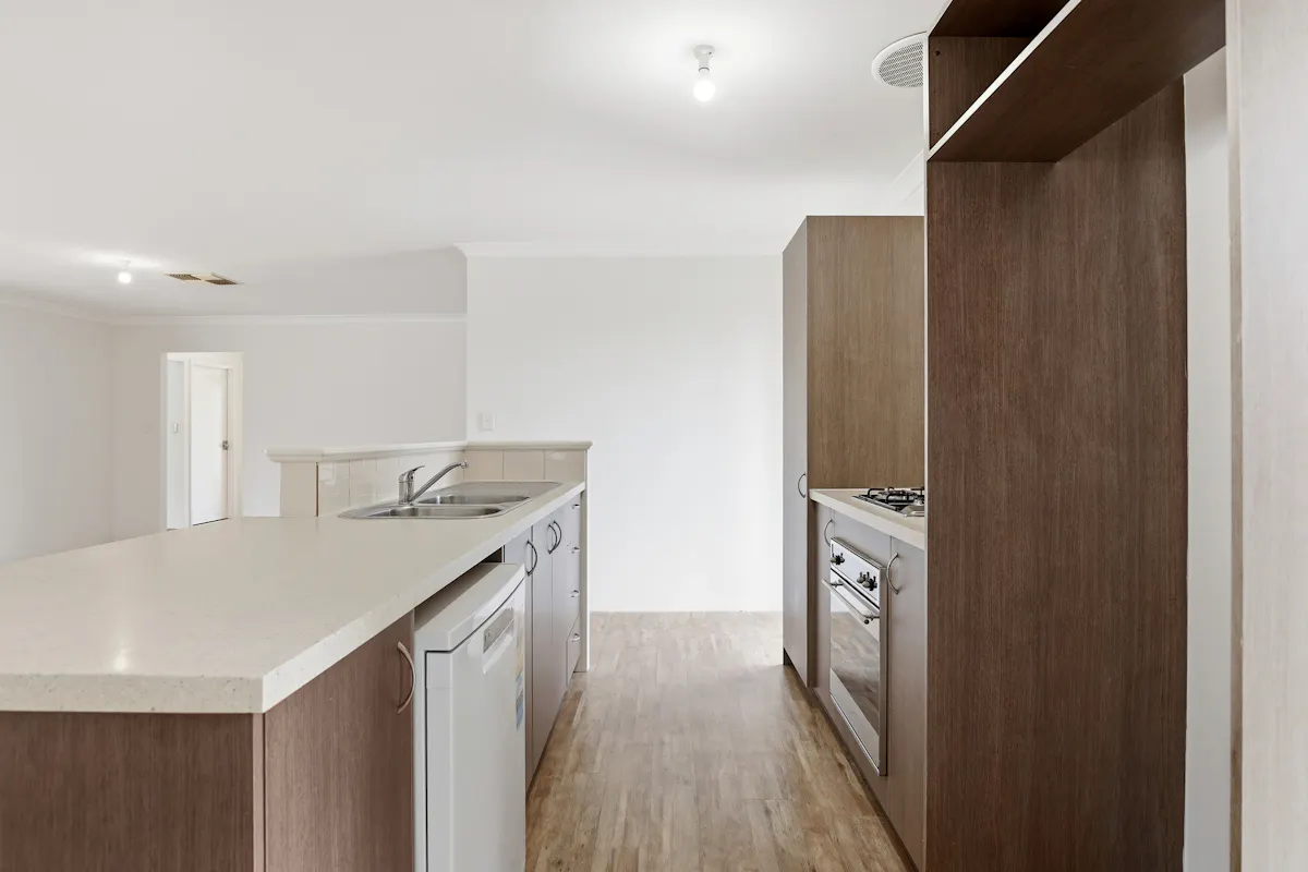Overlooking the main living space, the kitchen is both functional and inviting, featuring a dishwasher, island bench and gas stove, making it ideal for everyday living and entertaining alike.