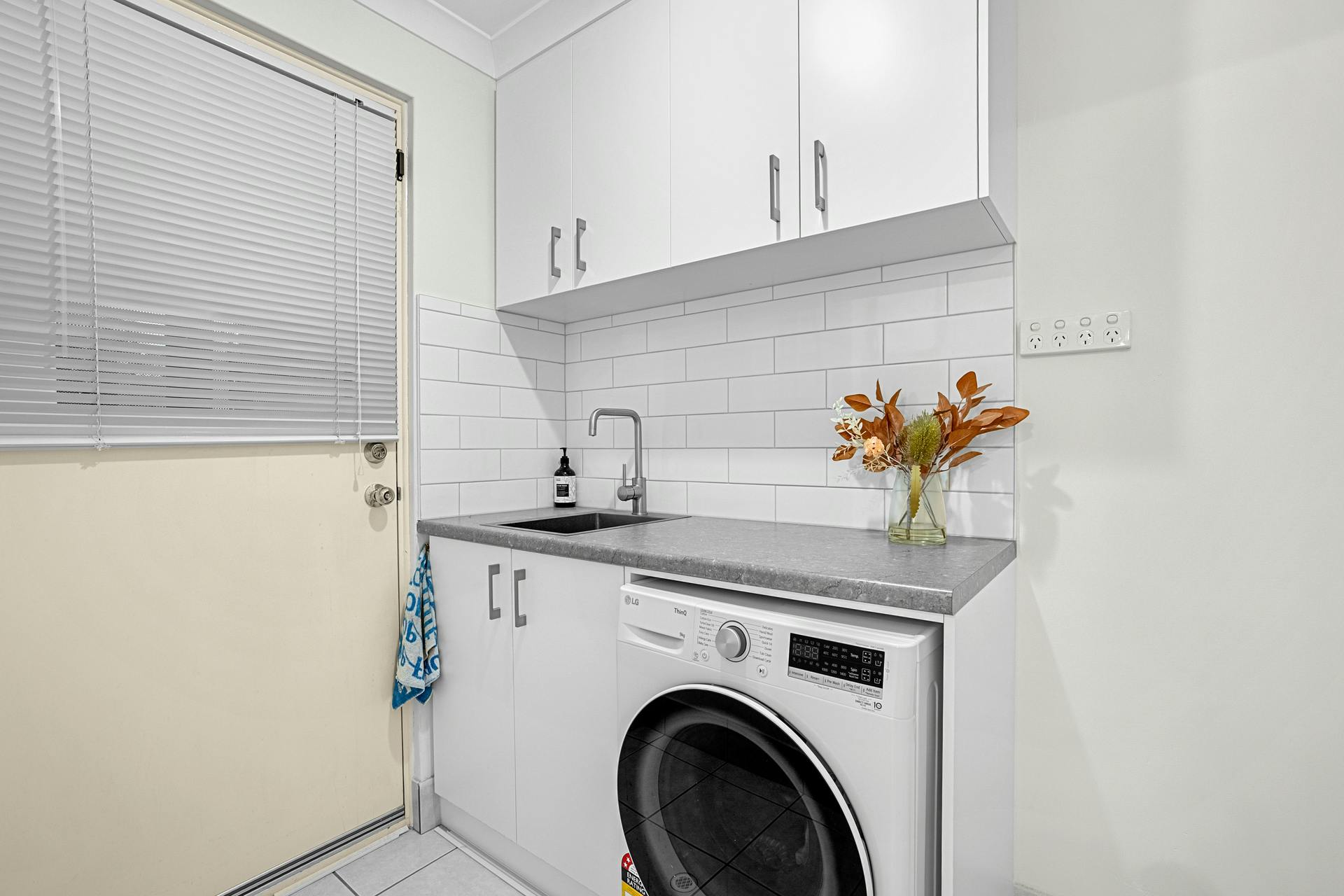 - Separate laundry with modern subway tiling