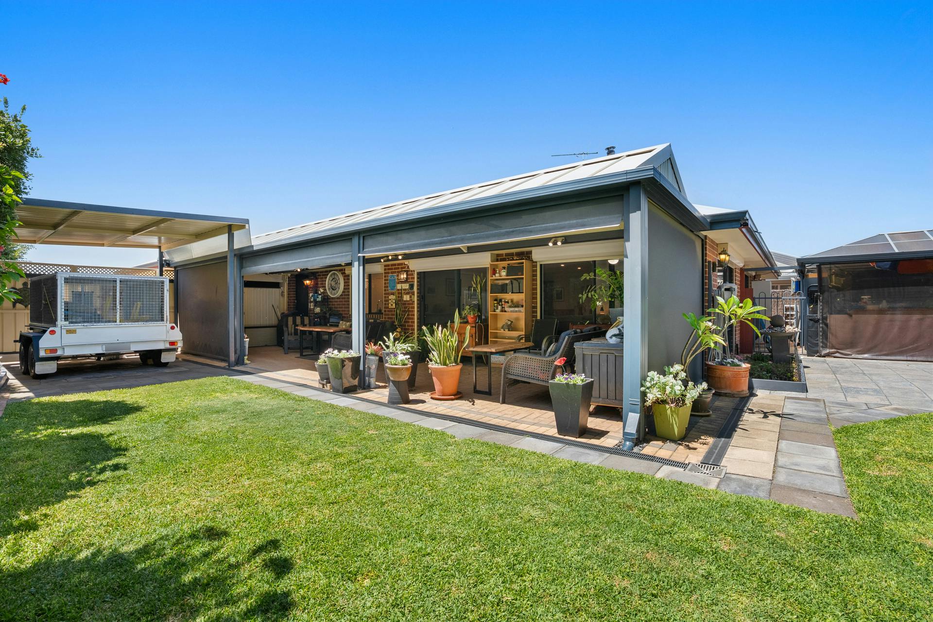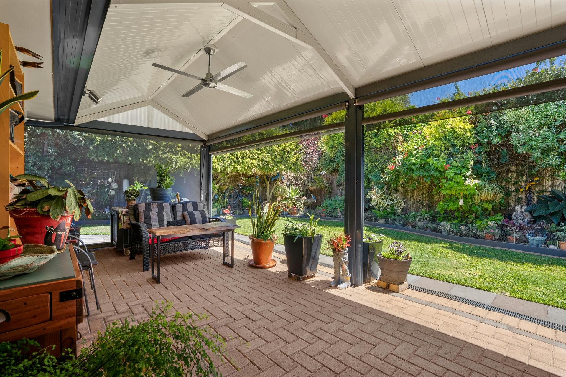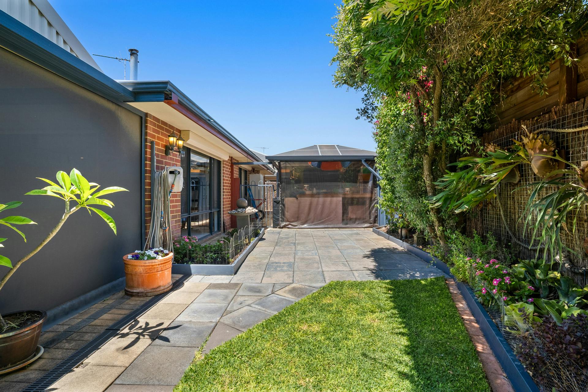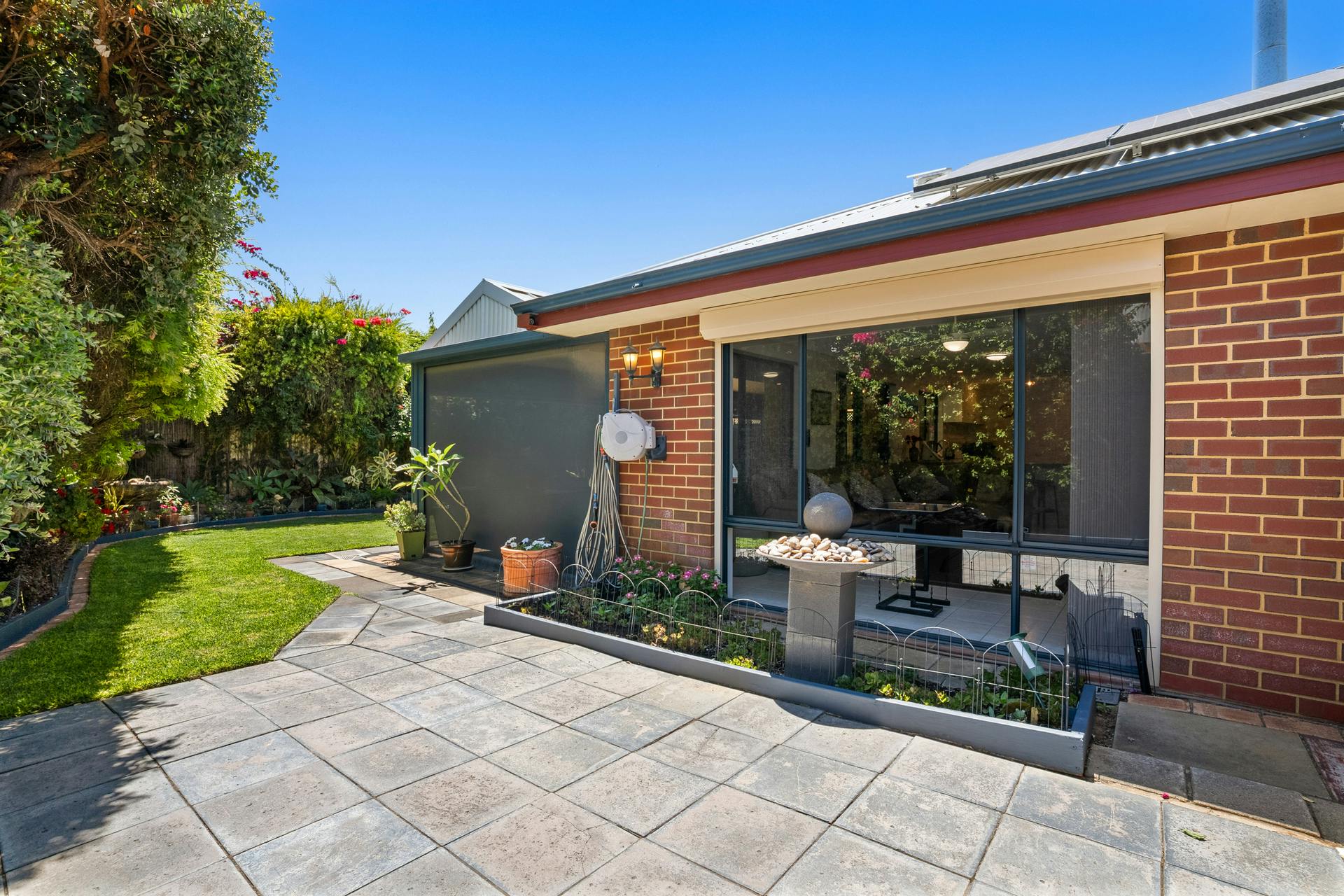 - Fully fenced and lawned backyard with colourful plants, greenery and trees to the border